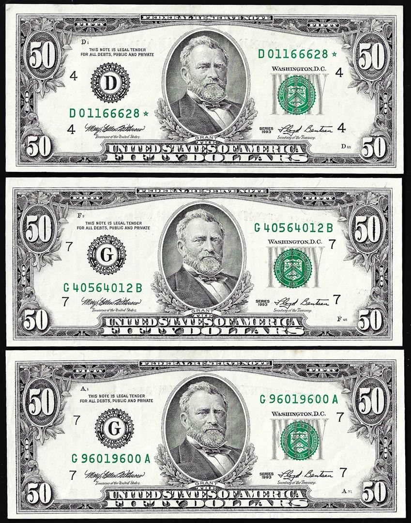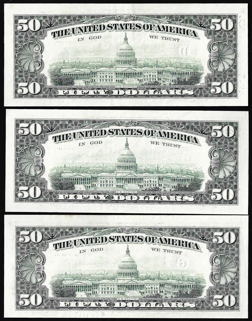 One Lot of (3) 1993 $50 Federal Reserve Notes Minor Offset Error.