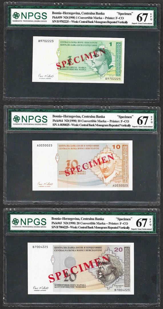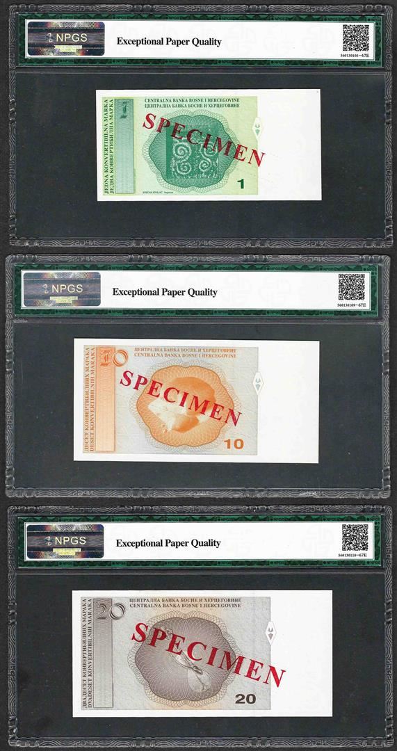 One Lot of (3) 1998 Bosnia Central Bank Specimen Notes.