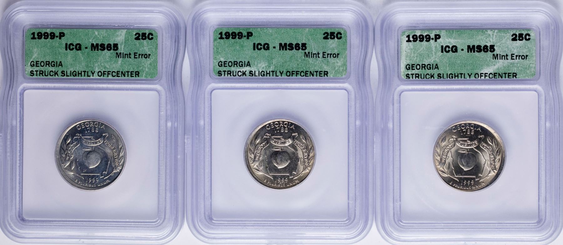 One Lot of (3) 1999-P Georgia State Quarter Coins ICG MS65 Struck Slightly Off center.