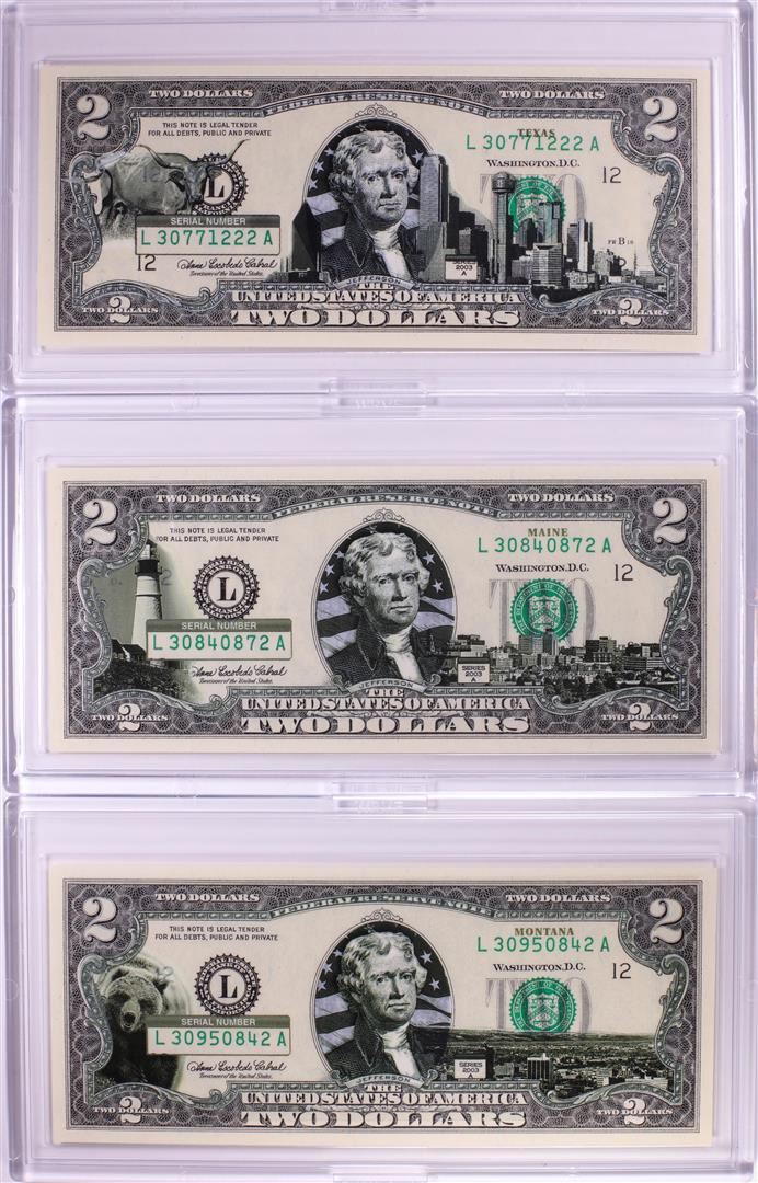 Lot of (3) 2003A $2 Colorized Overprint Federal Reserve Notes in Cases