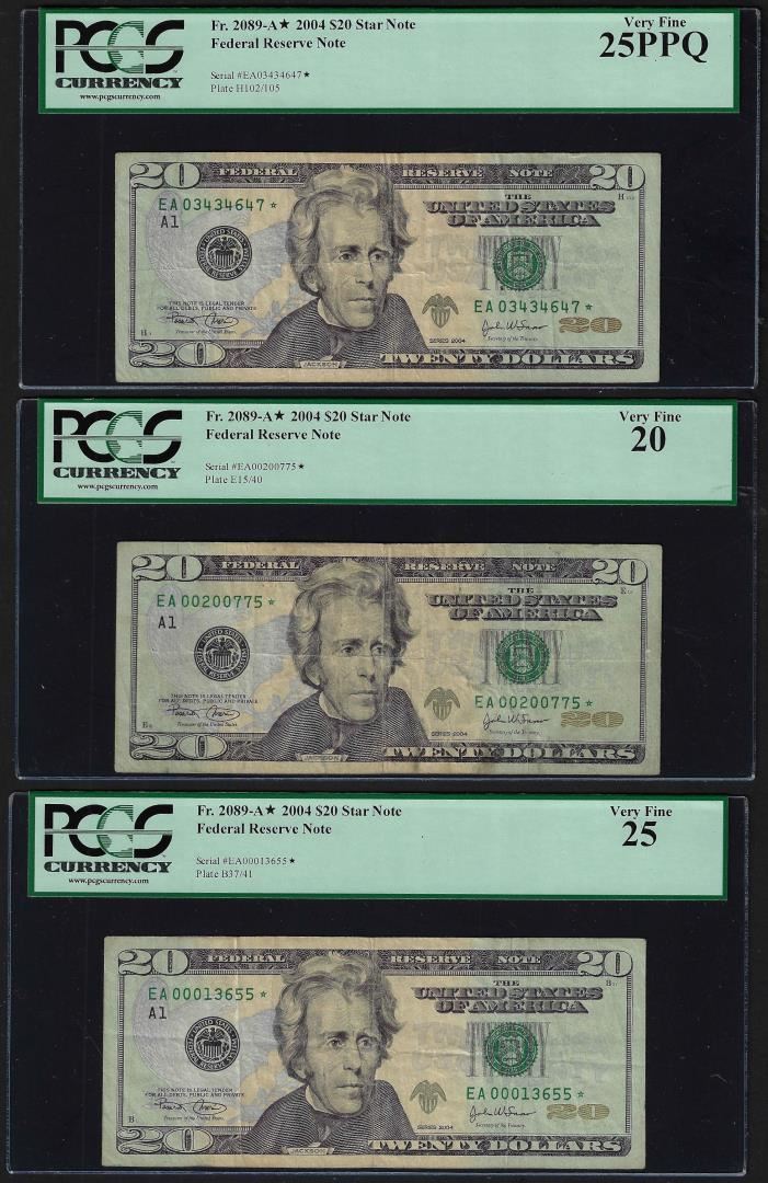 Lot of (3) 2004 $20 Federal Reserve STAR Notes Fr.2089-A* PCGS Graded