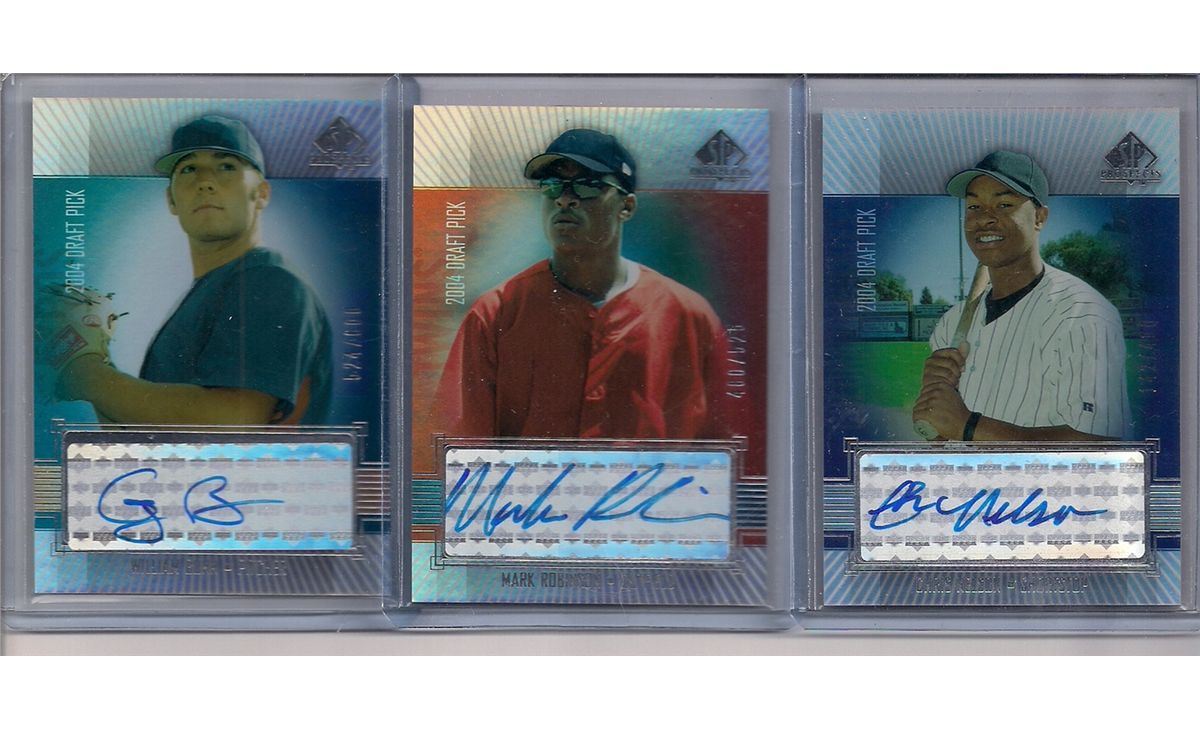 Lot of (3) 2004 SP Prospects Autographed Baseball Rookie Cards. This lot includes Chris Nelson, Mark Robinson, and William Bunn. All three Rookie Cards are signed in Blue Sharpee and all three are serial numbered. This lot is Near Mint.