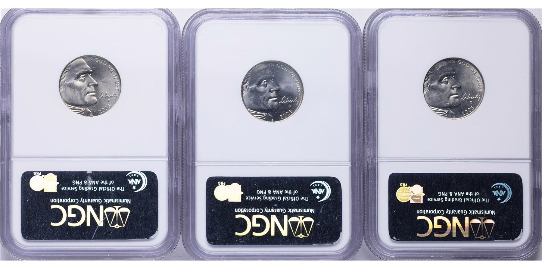 One Lot of (3) 2005 Bison Nickel Coins NGC MS65. NGC Certified.