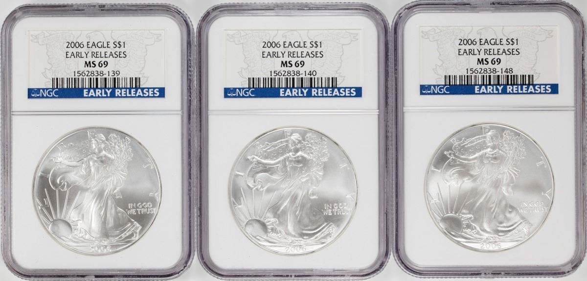 One Lot of (3) 2006 $1 American Silver Eagle Coins NGC MS69 Early Releases.