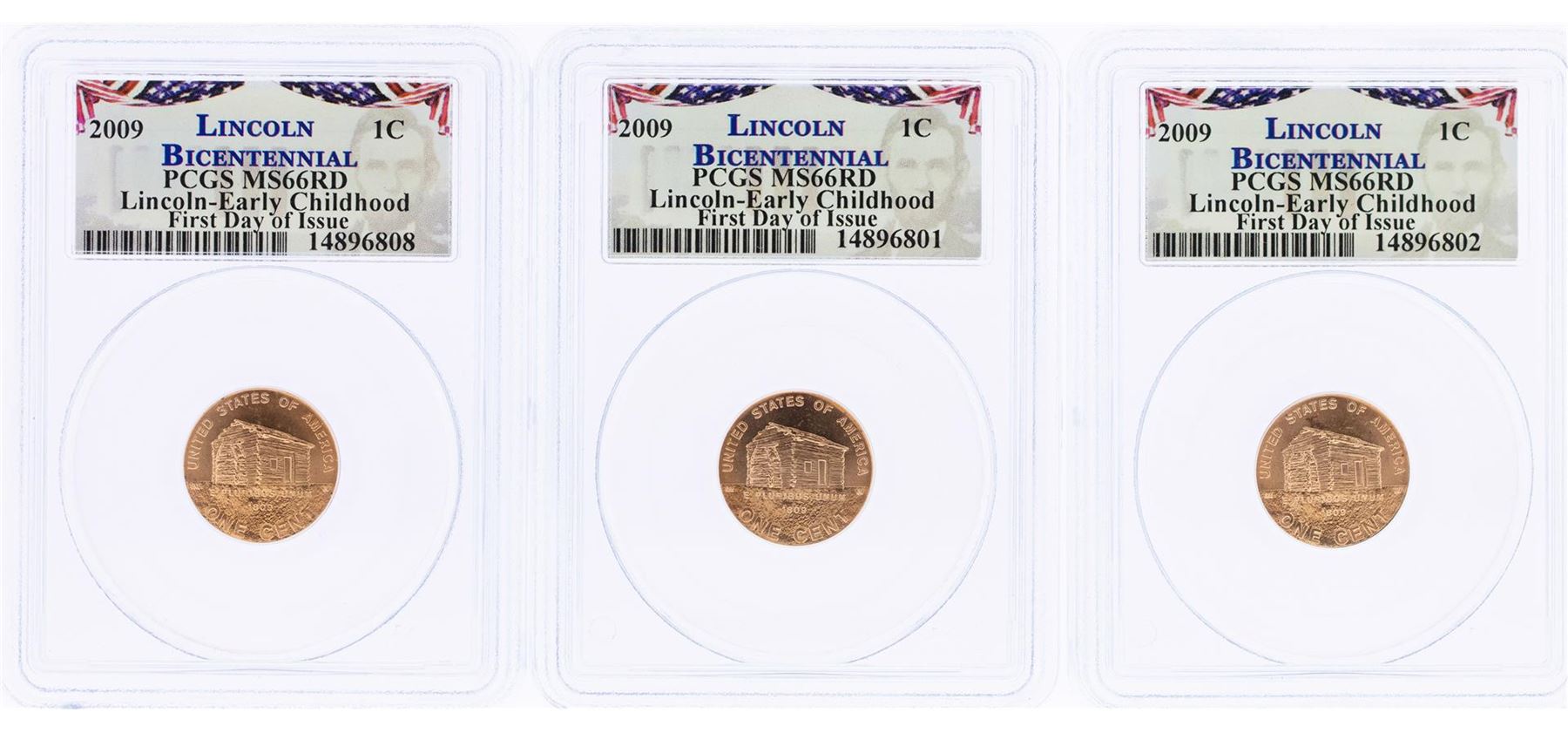 One Lot of (3) 2009 Bicentennial Lincoln Cent Coins PCGS MS66RD First Day of Issue. PCGS Graded.