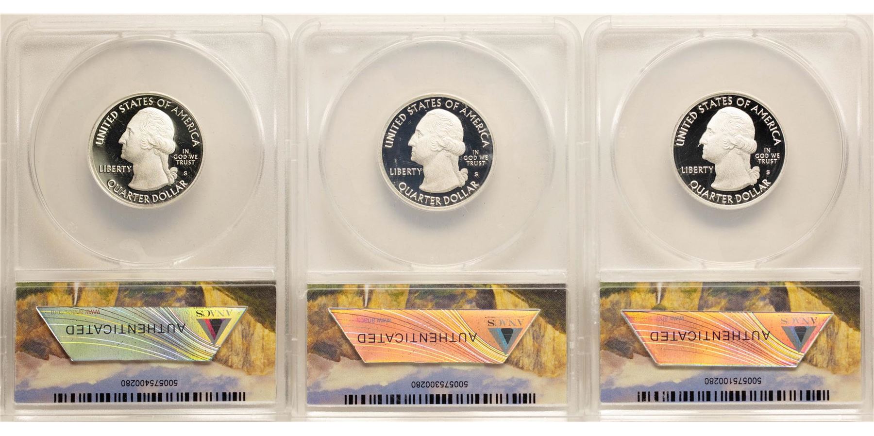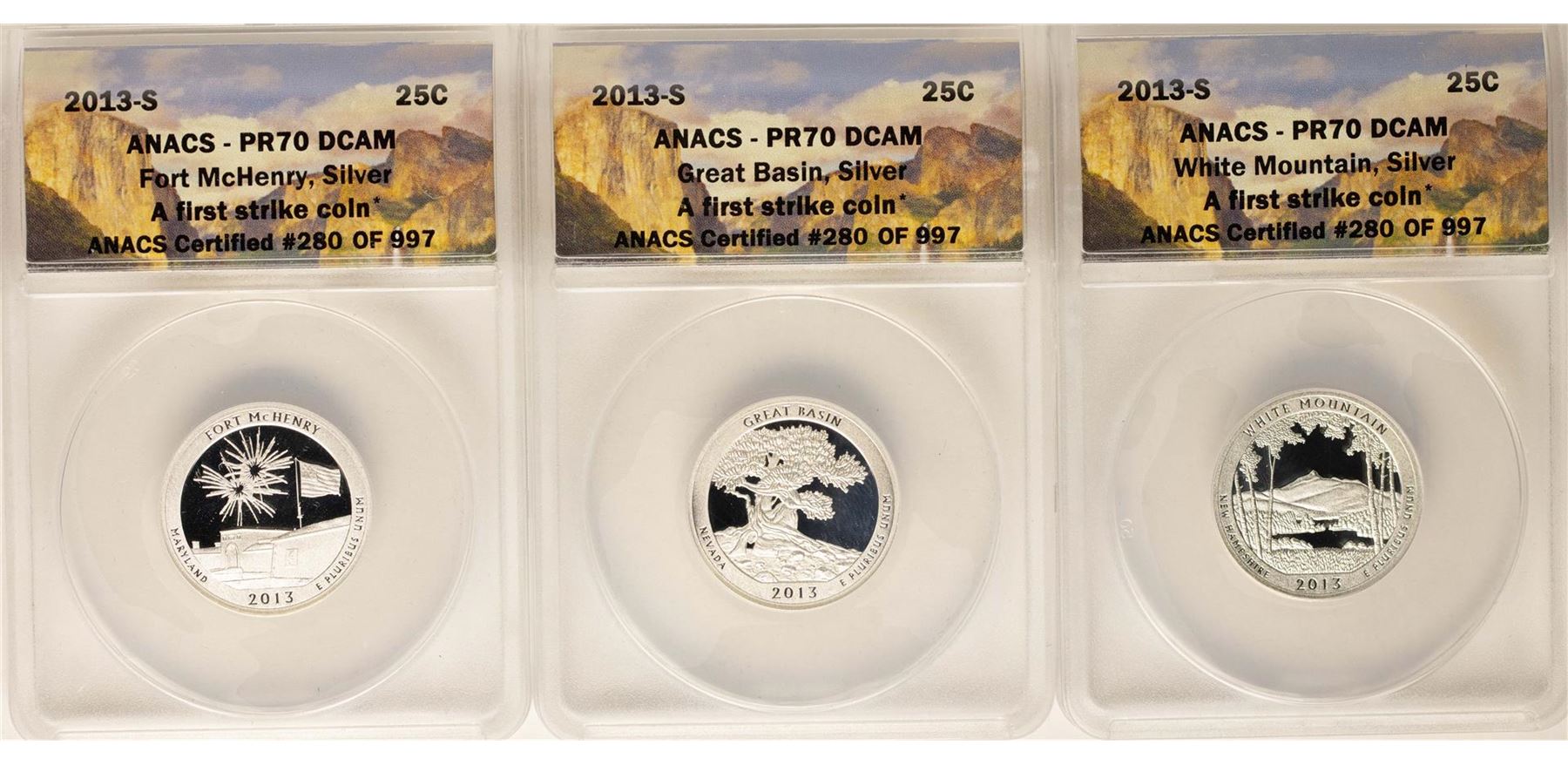 One Lot of (3) 2013-S Proof Silver America Beautiful Quarter Coins ANACS PR70 DCAM. ANACS Certified.