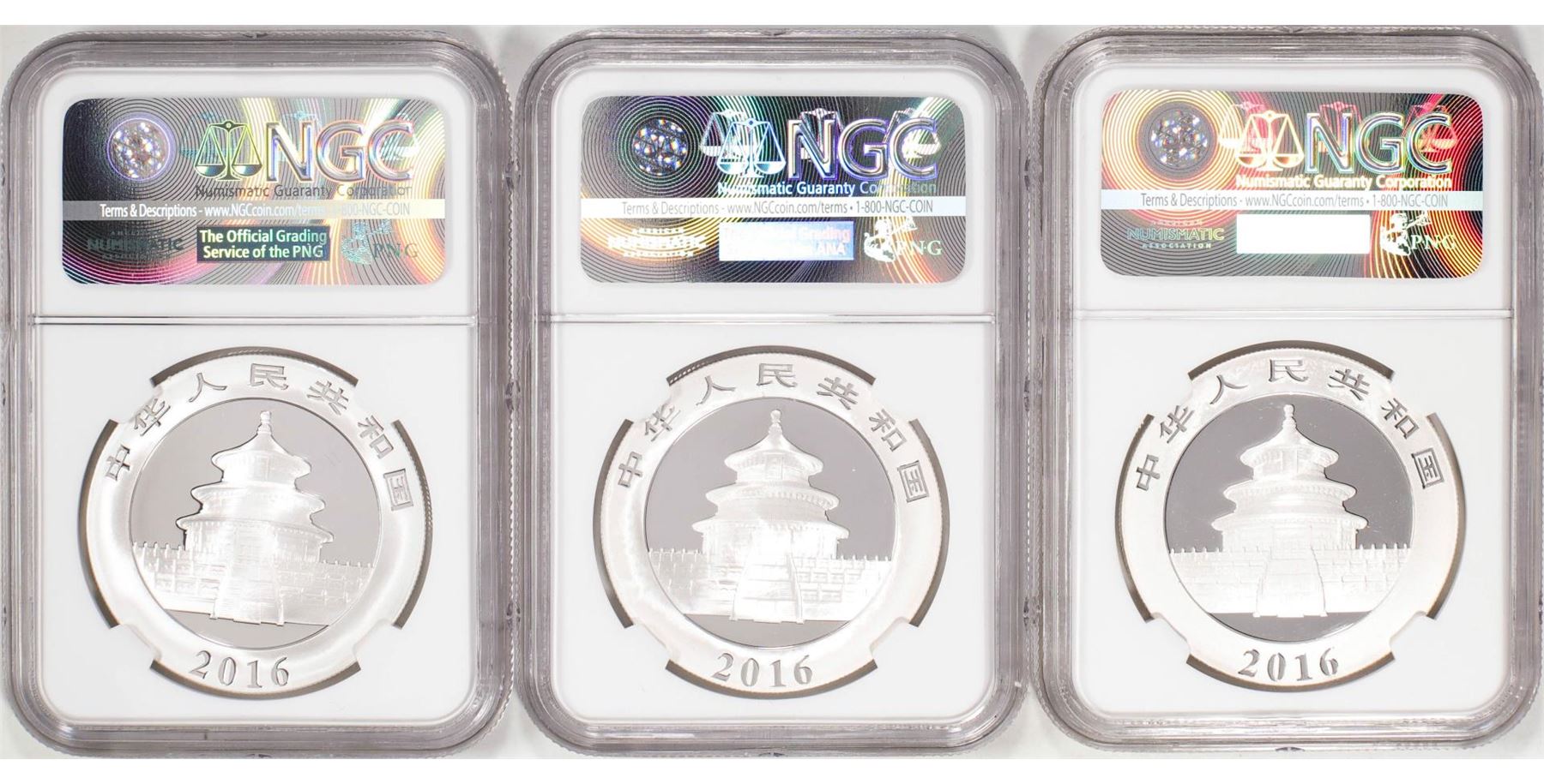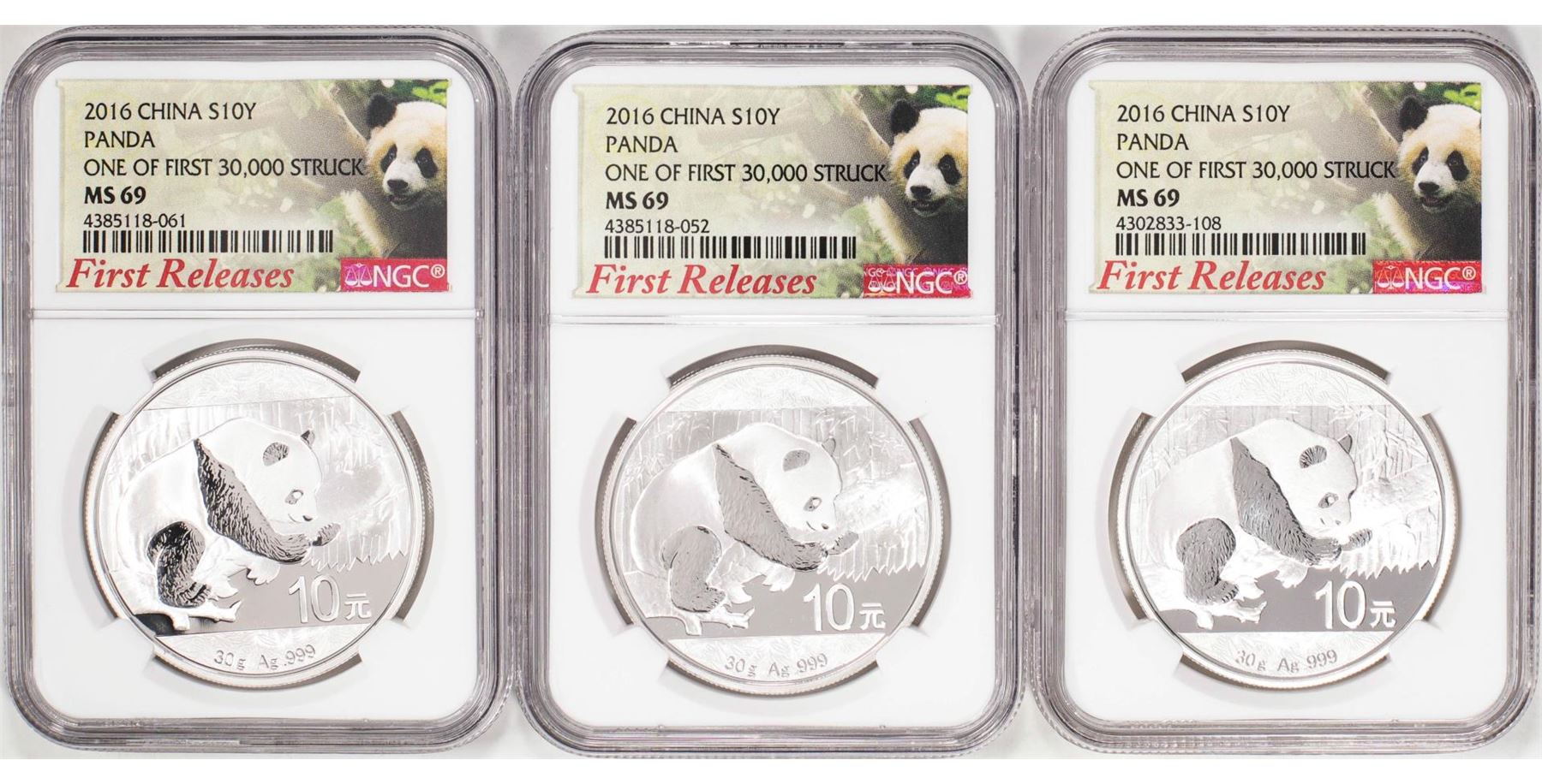 One Lot of (3) 2016 China 10 Yuan Silver Panda Coins NGC MS69 One of First 30,000 Struck. NGC Certified.