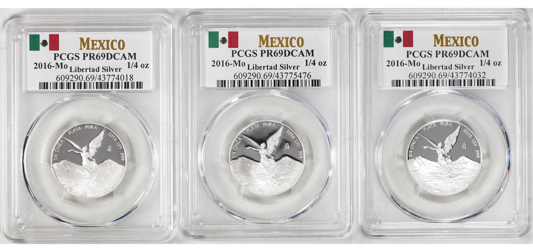 Lot of (3) 2016-Mo Mexico Proof 1/4 oz Silver Libertad Coins PCGS PR69DCAM
