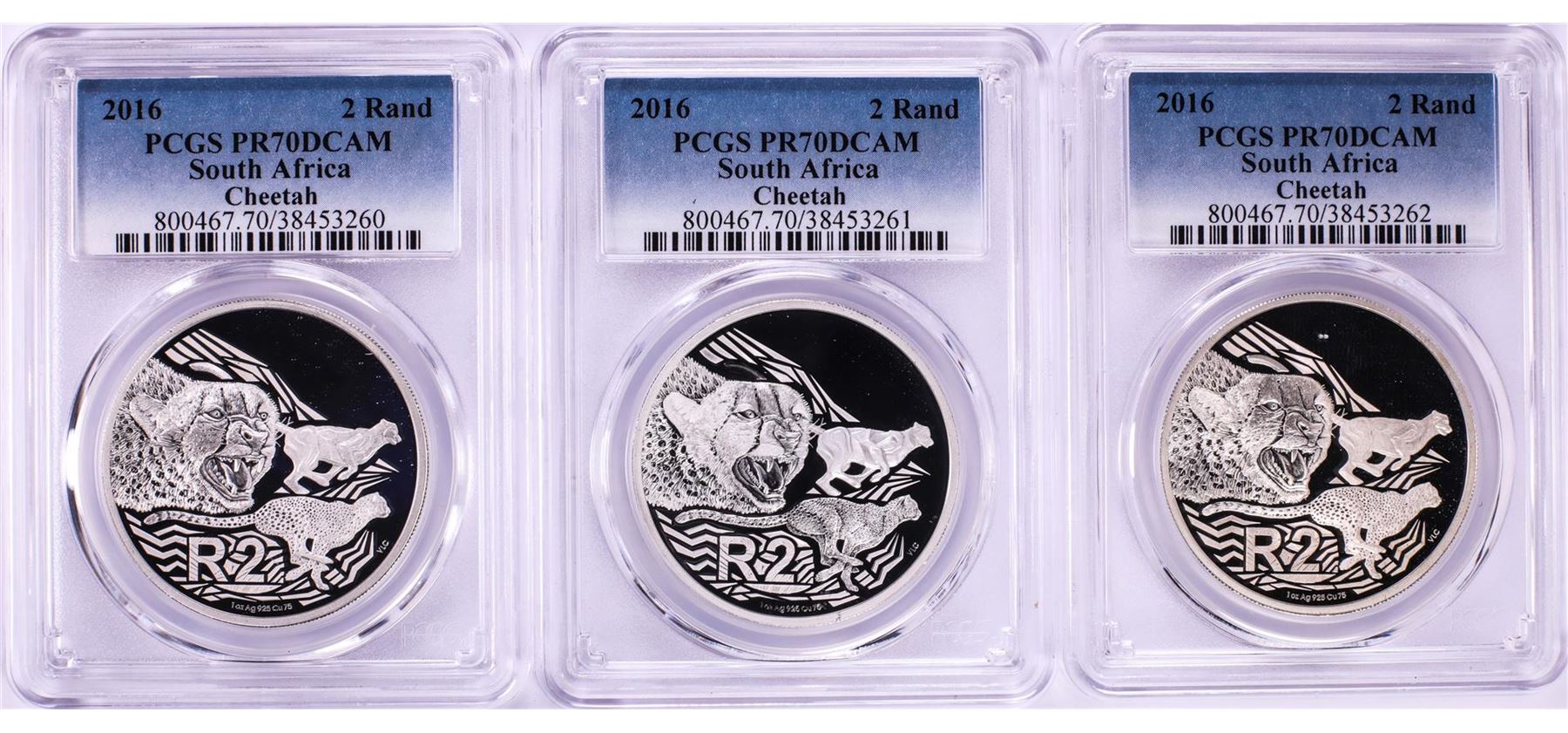 One Lot of (3) 2016 Proof South Africa 2 Rand Cheetah Silver Coins PCGS PR70DCAM. PCGS Graded.