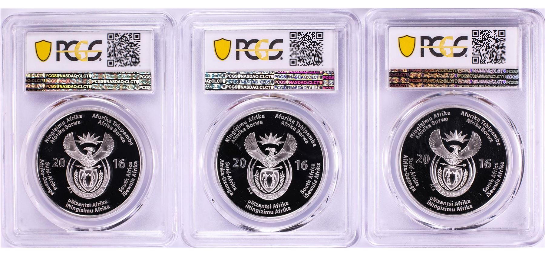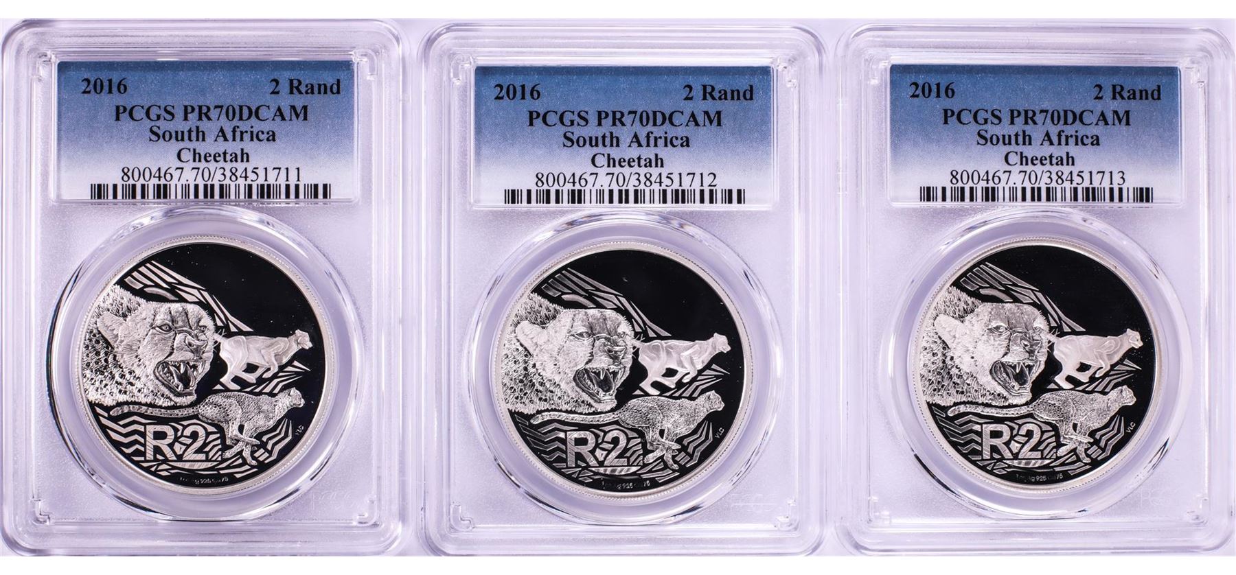 One Lot of (3) 2016 Proof South Africa 2 Rand Cheetah Silver Coins PCGS PR70DCAM. PCGS Graded.