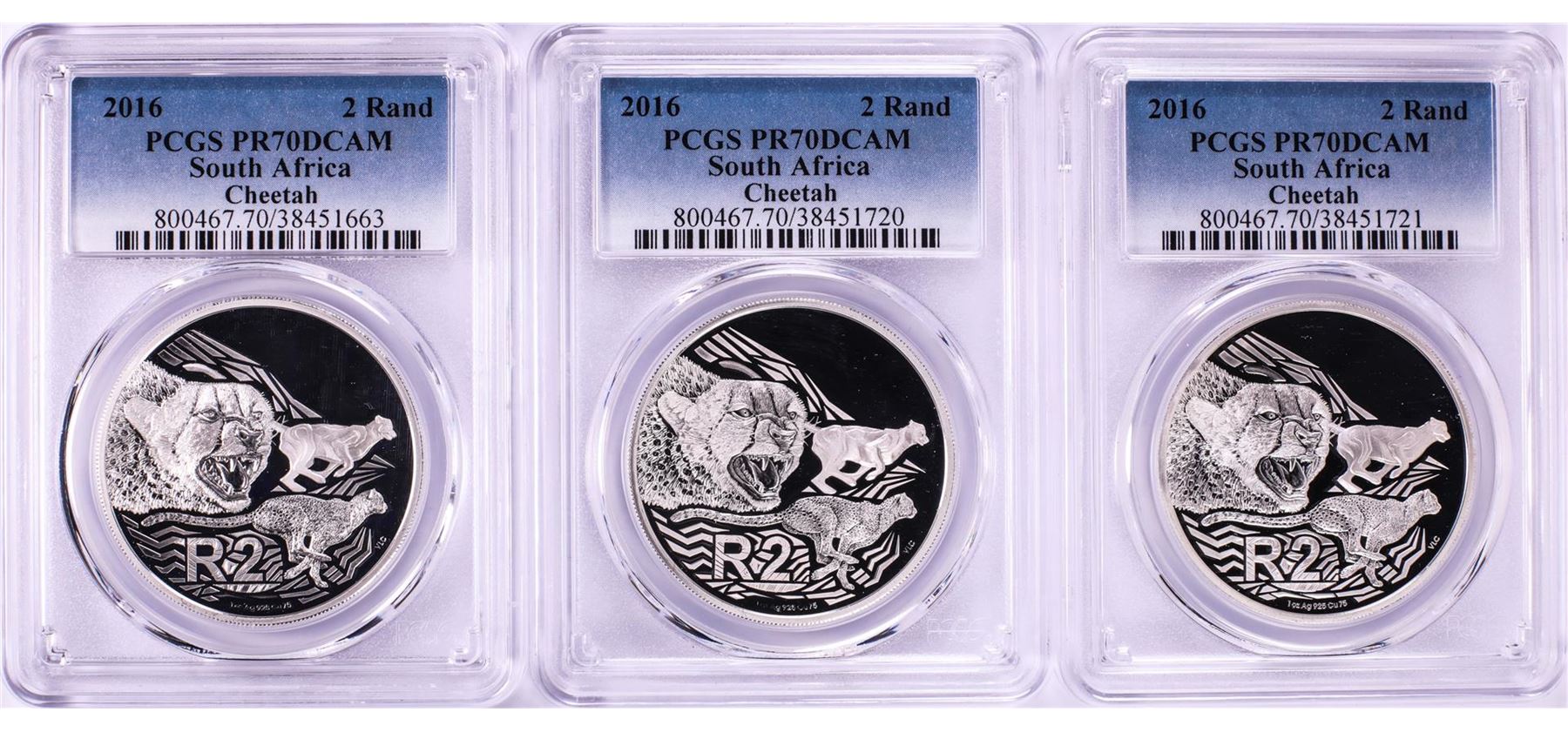 One Lot of (3) 2016 Proof South Africa 2 Rand Cheetah Silver Coins PCGS PR70DCAM. PCGS Graded.