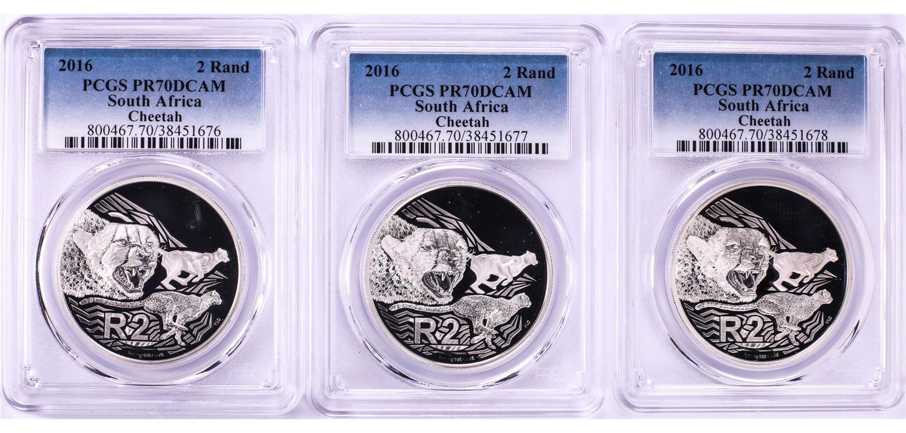 One Lot of (3) 2016 Proof South Africa 2 Rand Cheetah Silver Coins PCGS PR70DCAM. PCGS Graded.