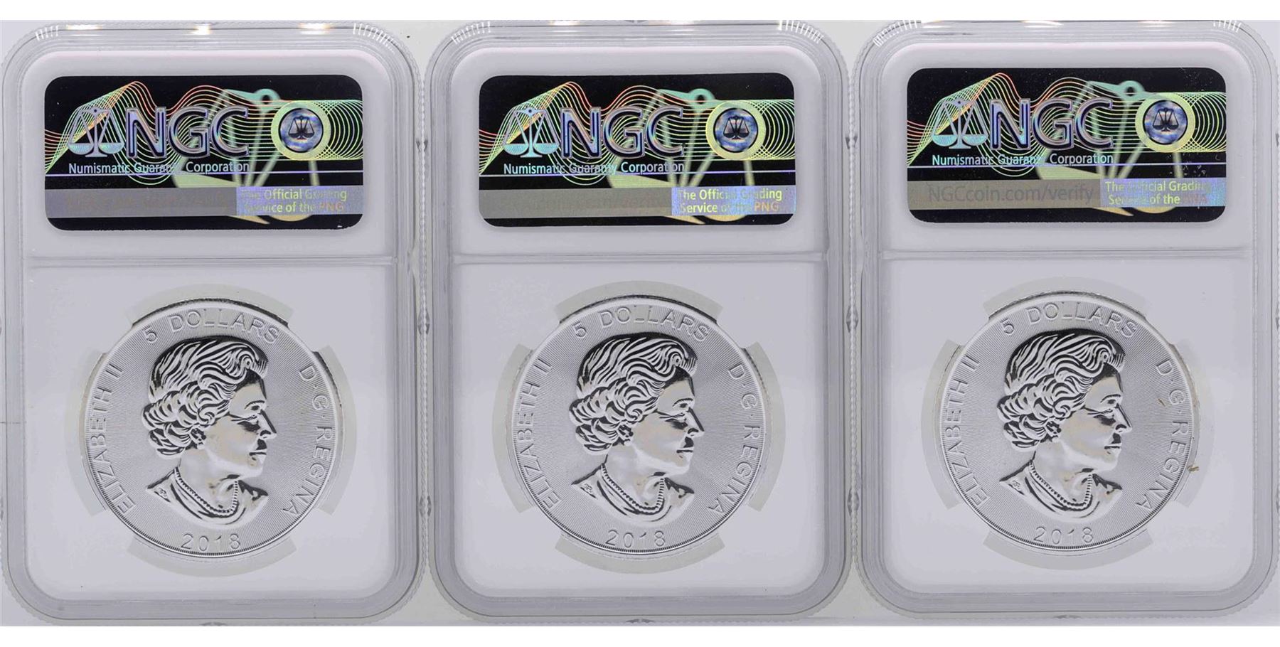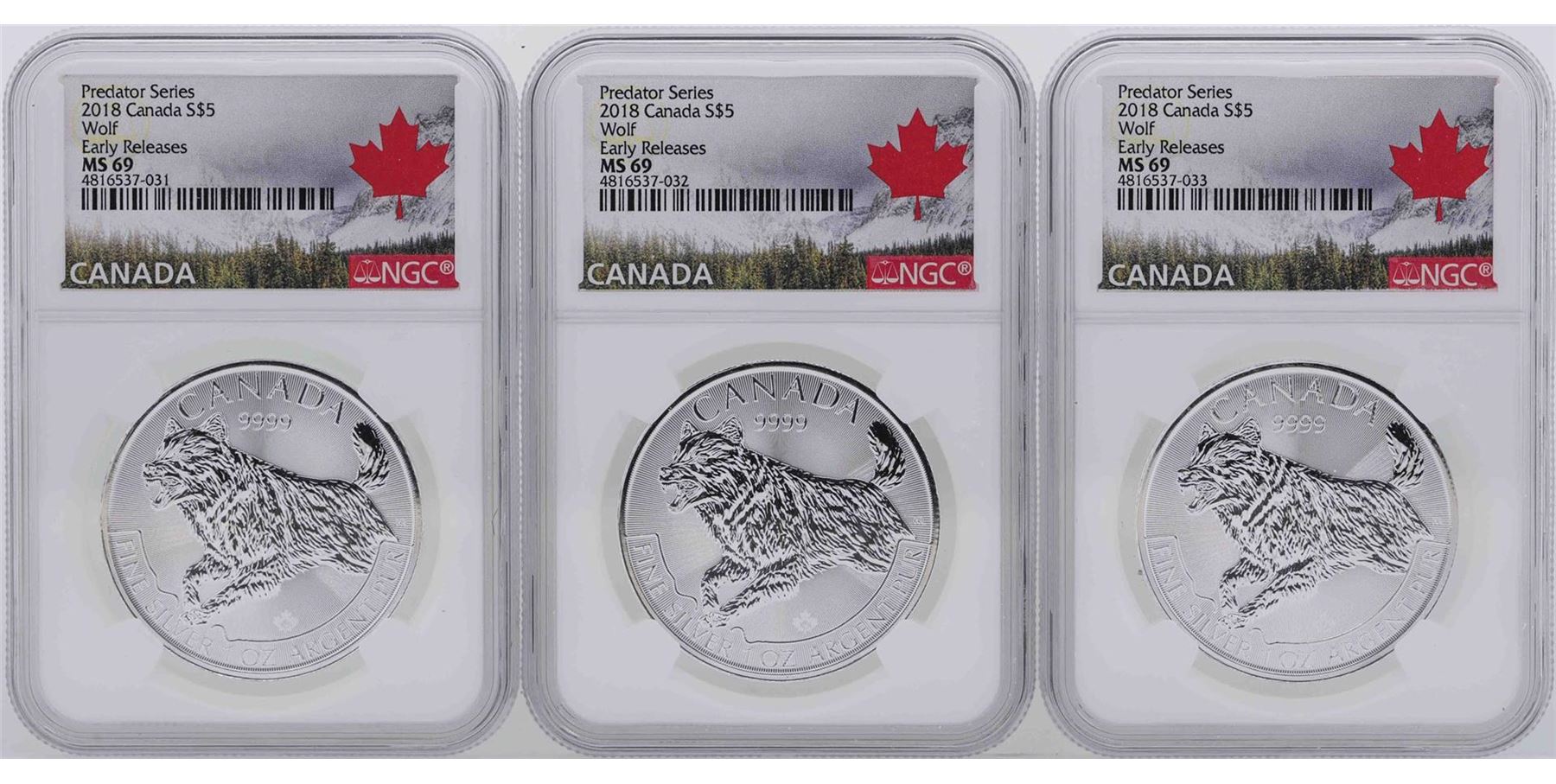 Lot of (3) 2018 $5 Canada Predator Series Wolf Silver Coin NGC MS69