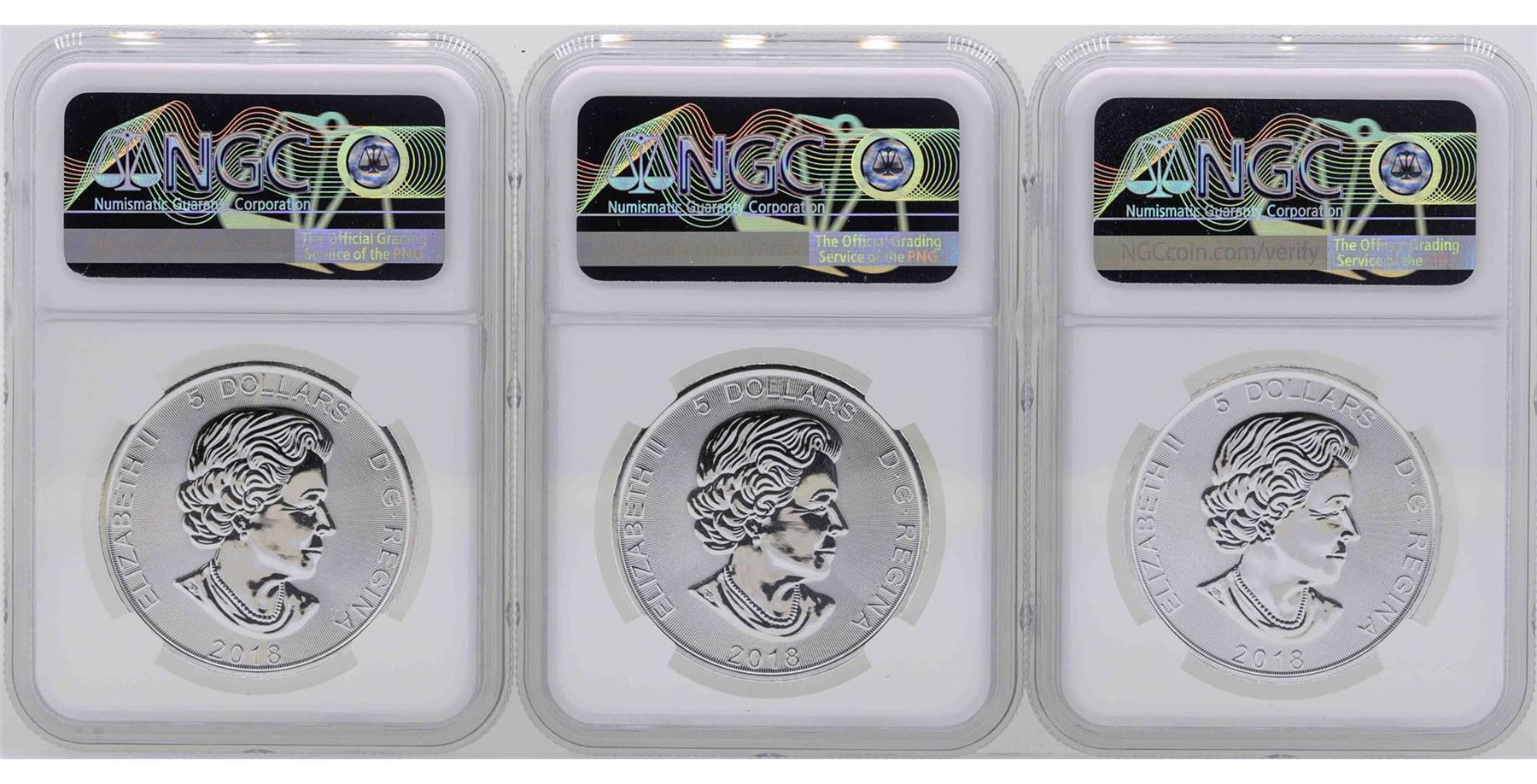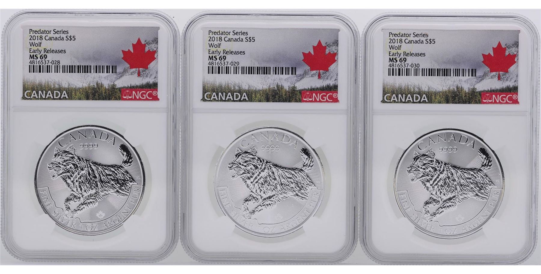Lot of (3) 2018 $5 Canada Predator Series Wolf Silver Coin NGC MS69