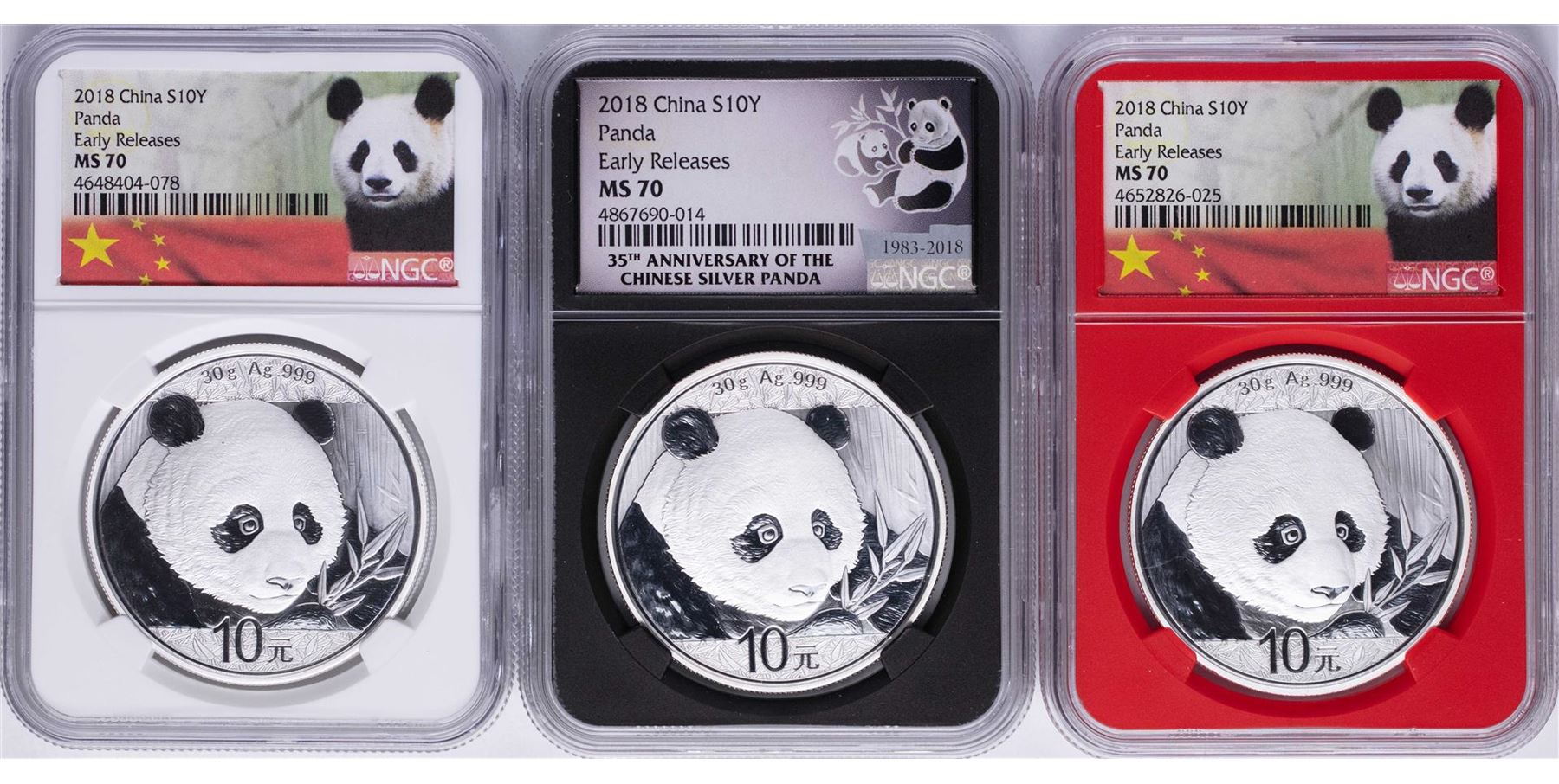 One Lot of (3) 2018 China Panda Silver Coins NGC MS70 Early Releases. NGC Certified.