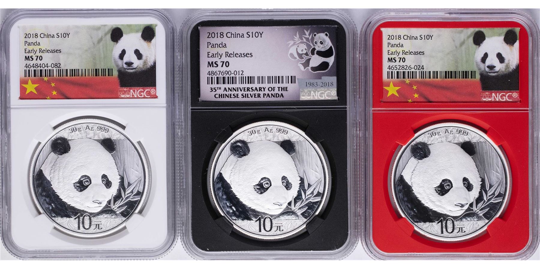 One Lot of (3) 2018 China Panda Silver Coins NGC MS70 Early Releases. NGC Certified.