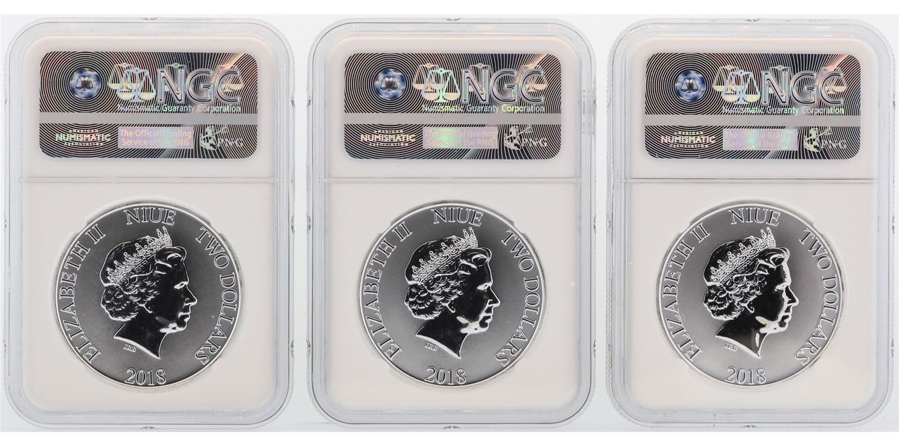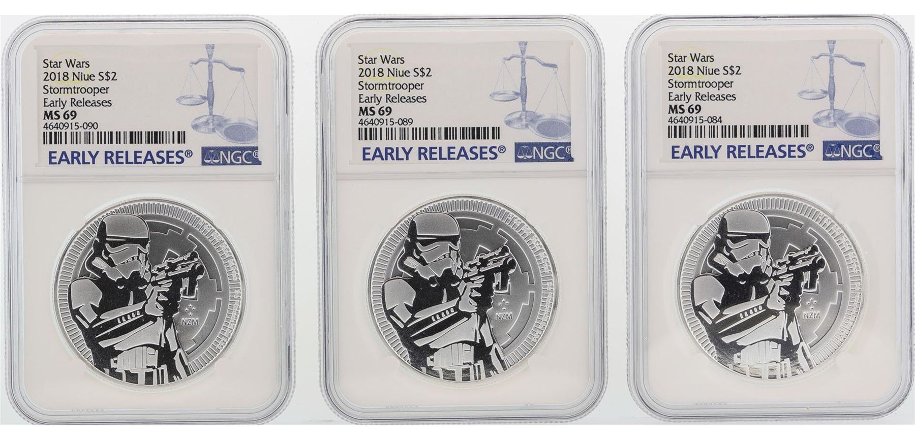 One Lot of (3) 2018 Niue $2 Star Wars Stormtrooper Silver Coins NGC MS69 Early Releases. NGC Certified.