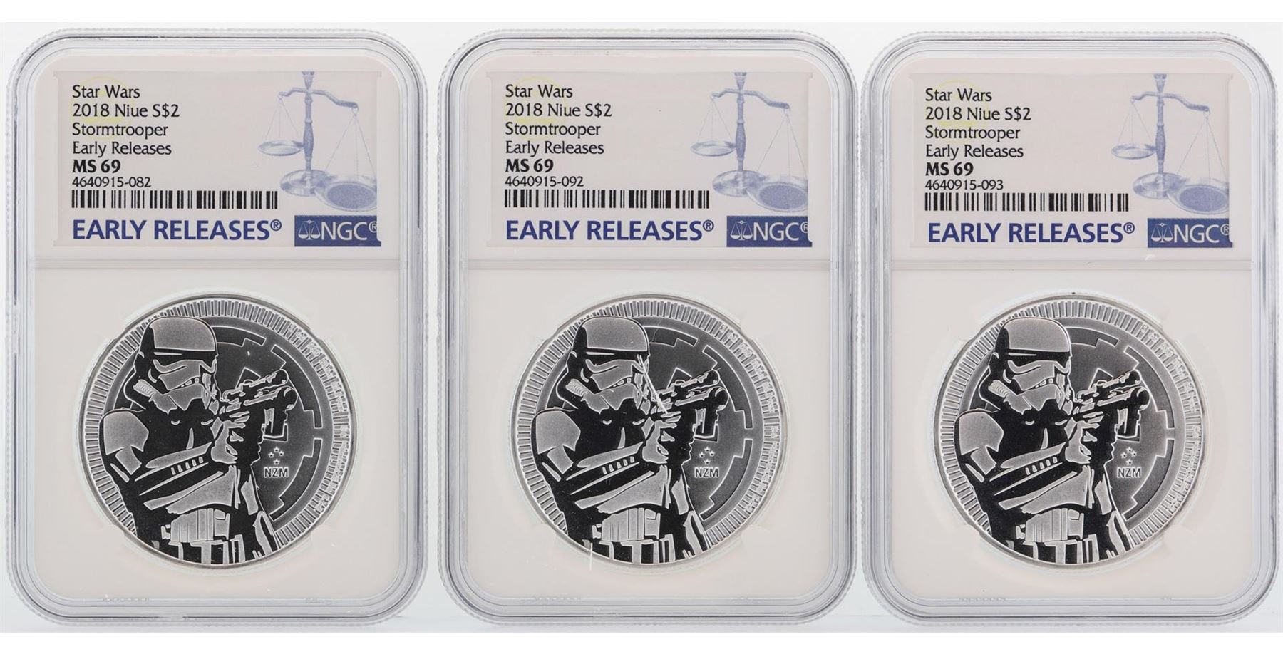 One Lot of (3) 2018 Niue $2 Star Wars Stormtrooper Silver Coins NGC MS69 Early Releases. NGC Certified.