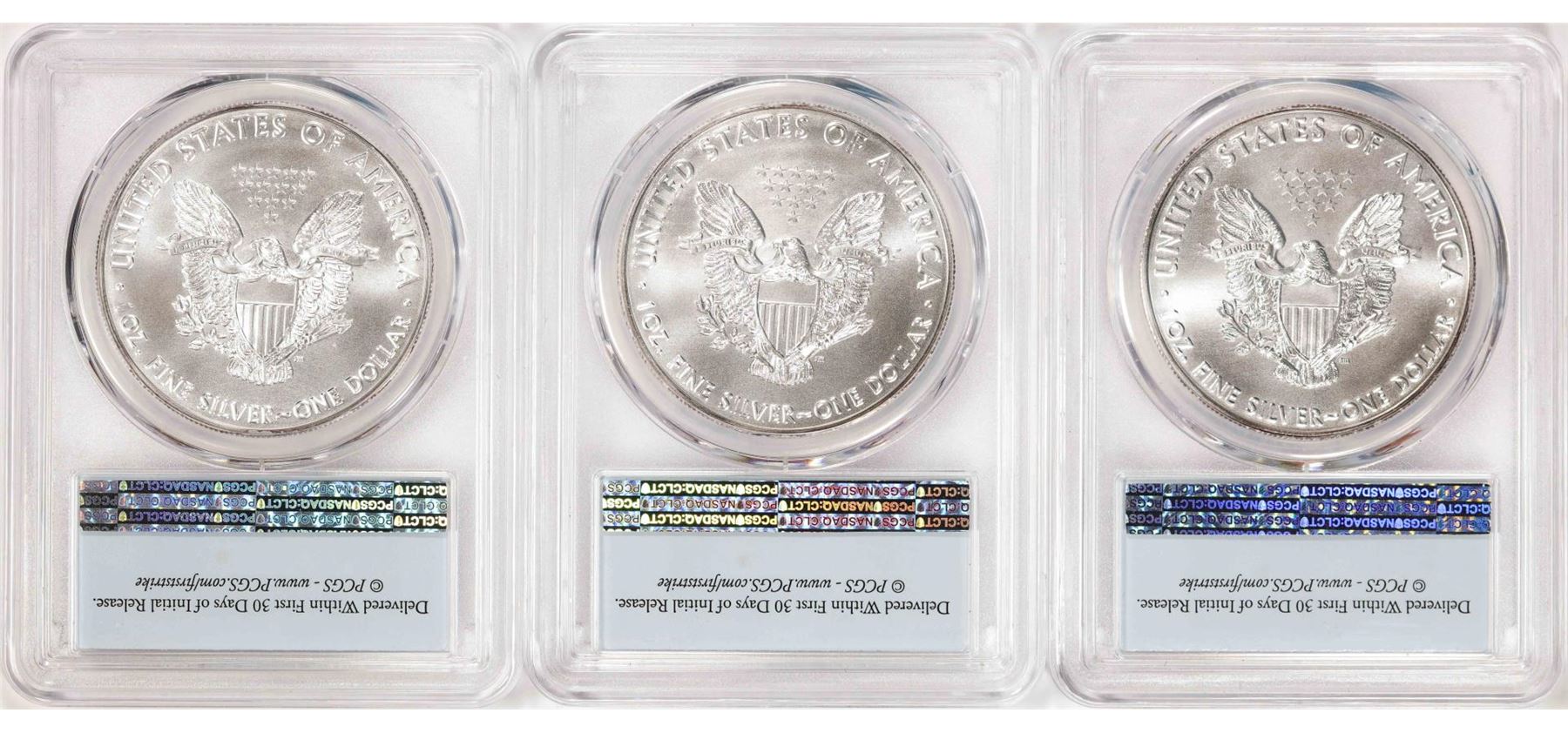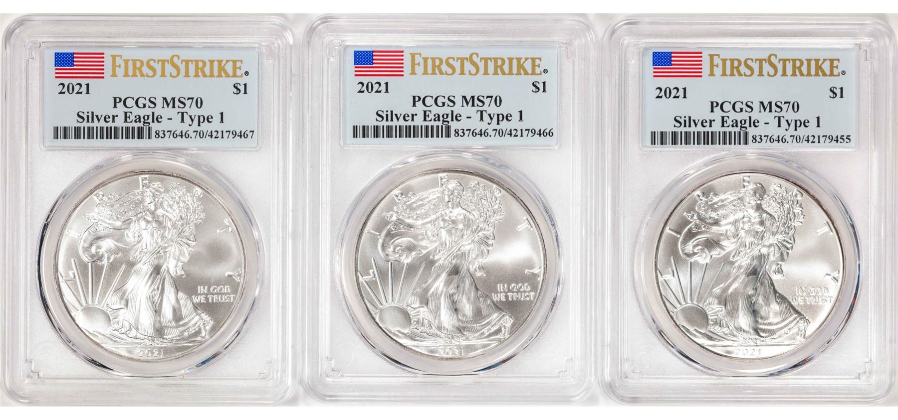 One Lot of (3) 2021 Ty. 1 $1 American Silver Eagle Coins PCGS MS70 First Strike. PCGS Graded.