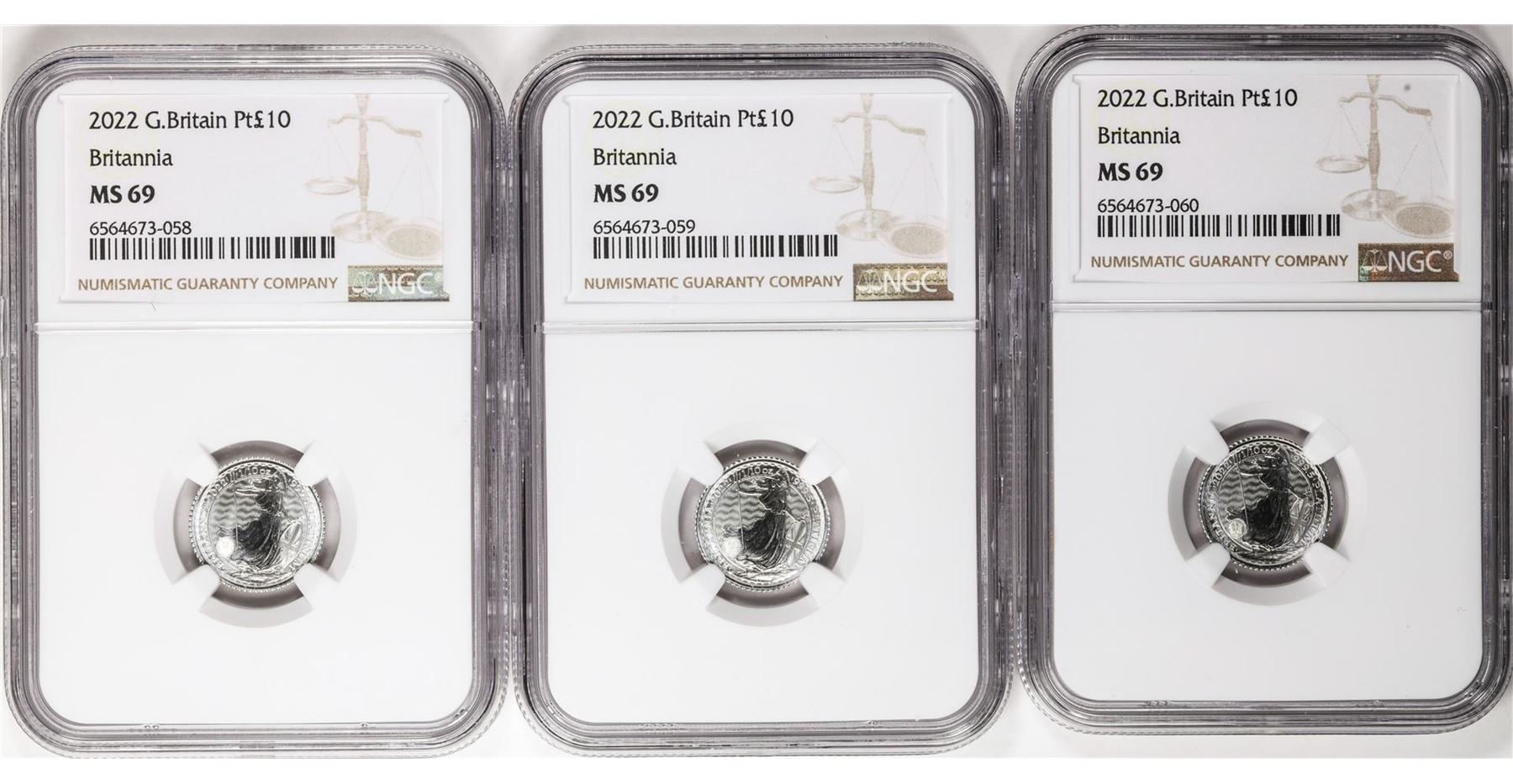 One Lot of (3) 2022 Great Britain 10 Pounds Britannia 1/10oz Platinum Coins NGC MS69. NGC Certified.