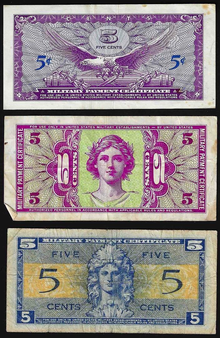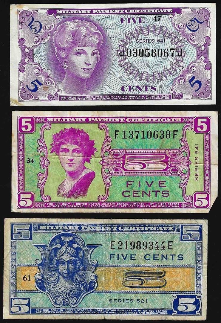One Lot of (3) 5 Cent Military Payment Certificate Notes.