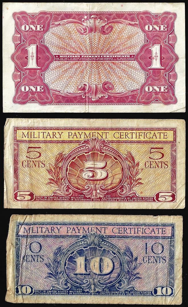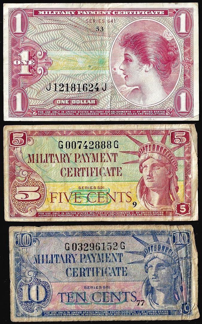 Lot of (3) 5 cents, 10 cents and $1 Military Payment Certificate Notes