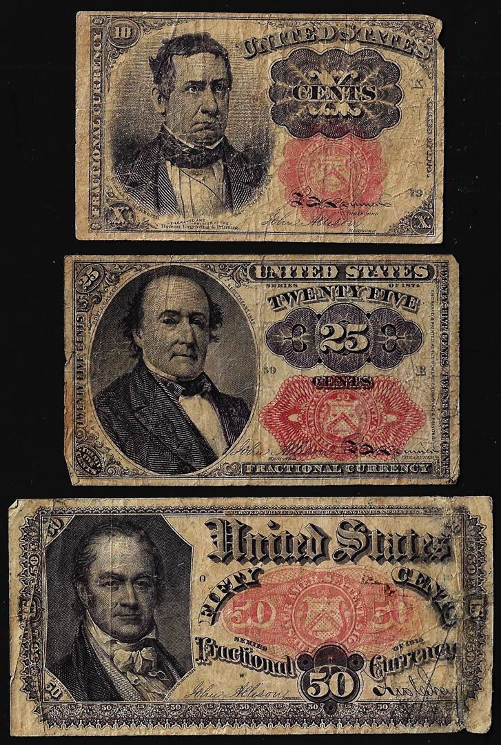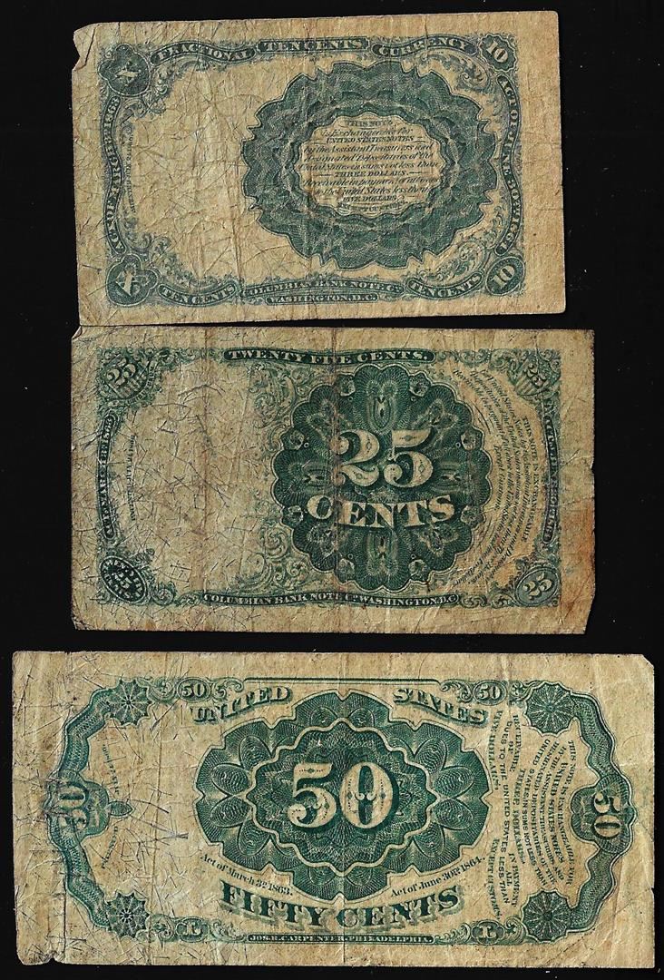 One Lot of (3) 5th Issue 10/25/50 Cents Fractional Currency Notes.