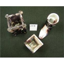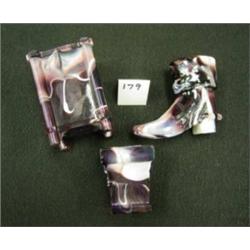 Akro Agate purple slag glass.  Lot of 3.  3.25" boot, 2.5" toothpick holders, 3-5/8" match or cigarette holder.  Condition:  All in good condition with minor corner chips on small toothpick and one top corner chip on match holder.