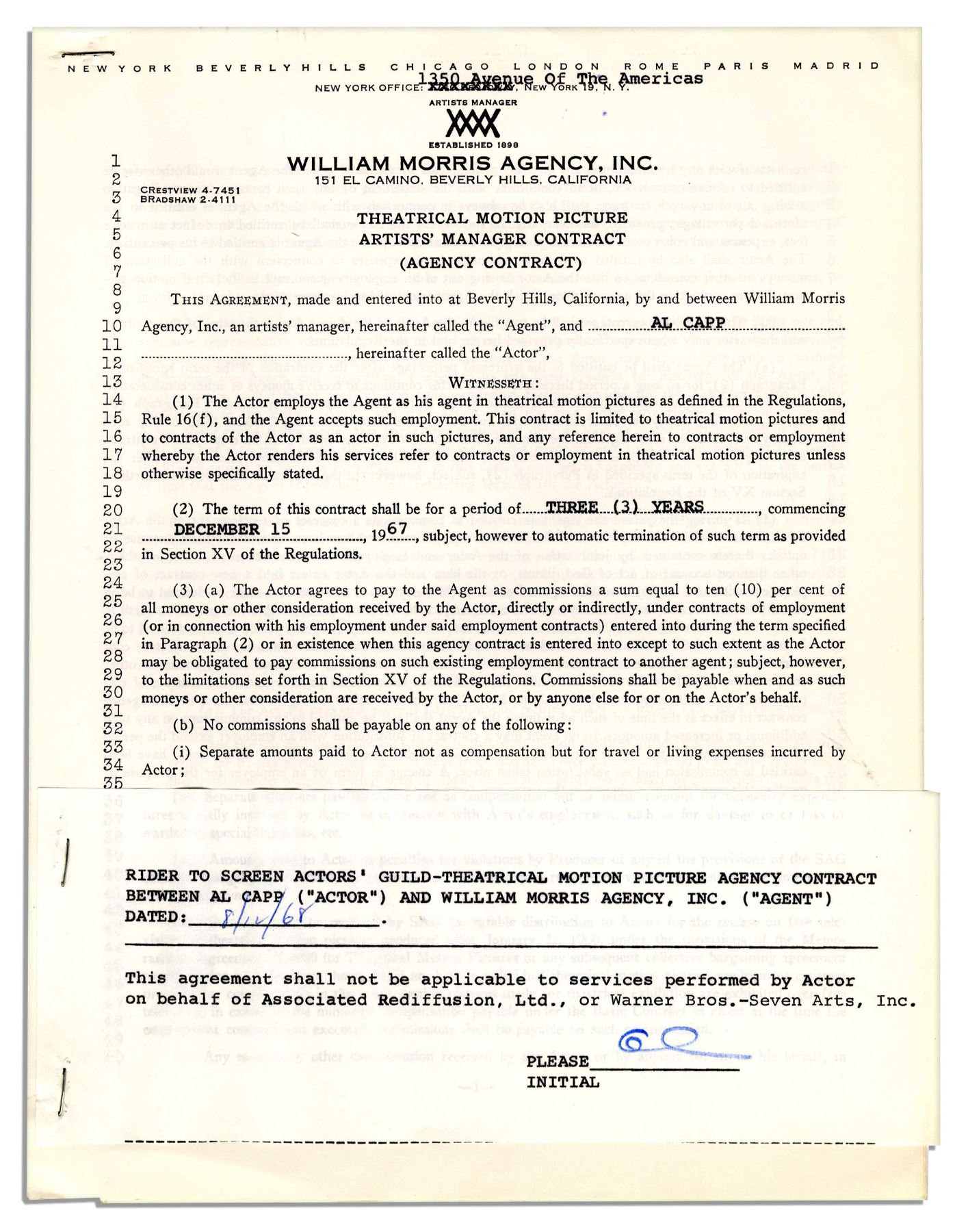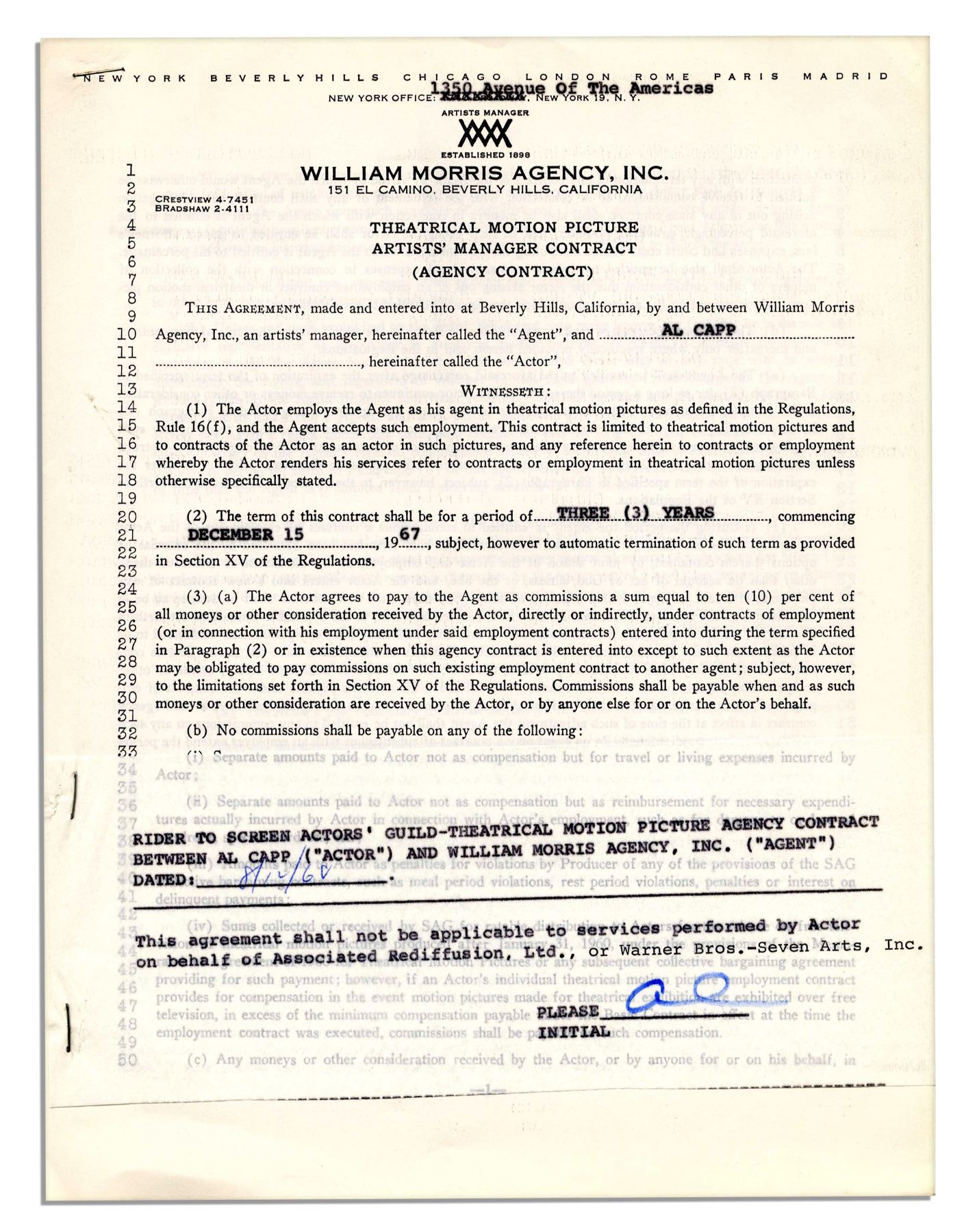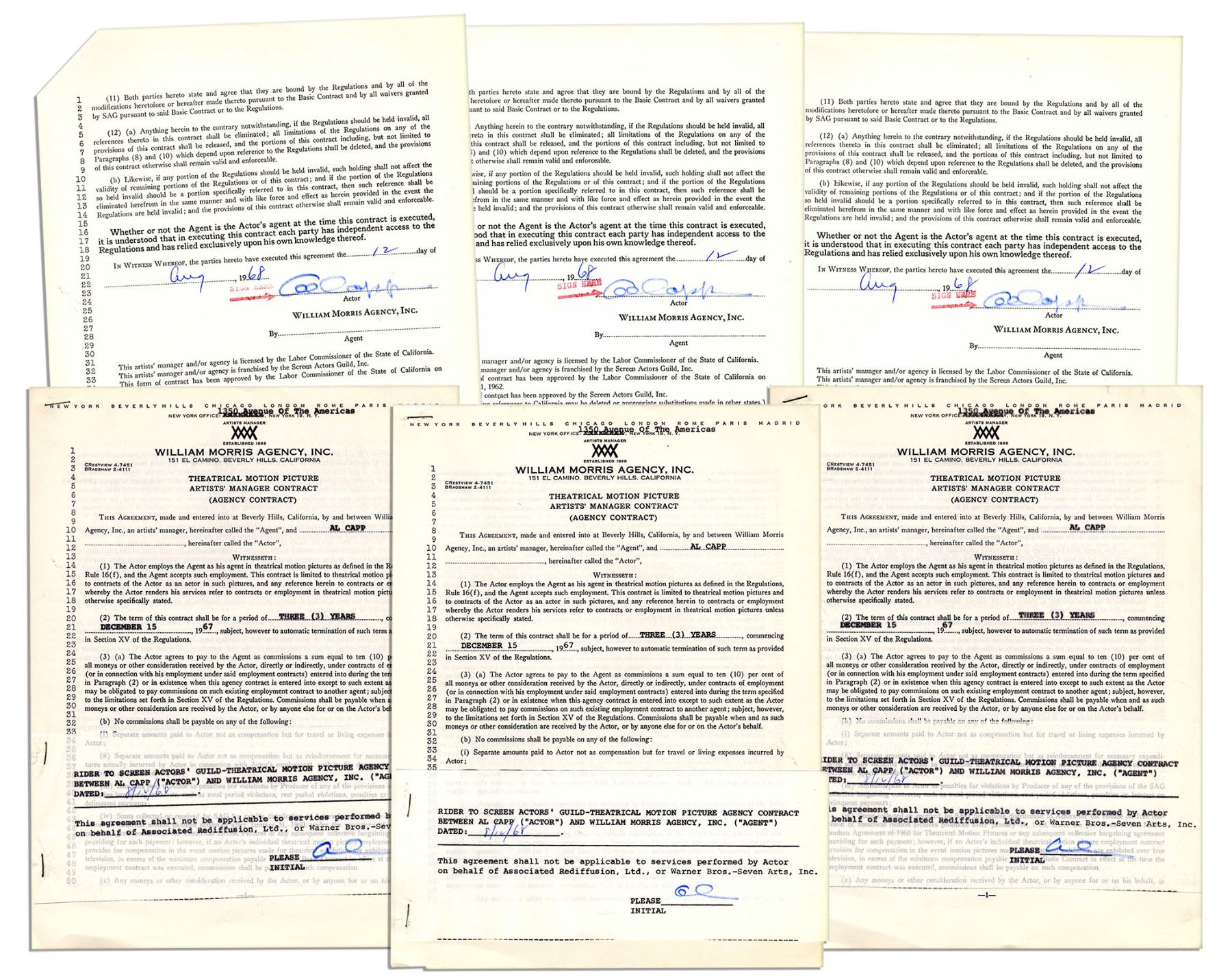 Lot of three contracts signed by Al Capp with the William Morris Agency, all from the late 1960s. Contracts list Capp's various agents with the terms denoting 10% of his earnings to be paid to them. Each contract is signed by Capp ''AC'' in blue ink on a slip stapled to page one, and ''Al Capp'' to page four. Contracts measure 8.5'' x 11'' and each run 7pp. Toning and creasing, else near fine.