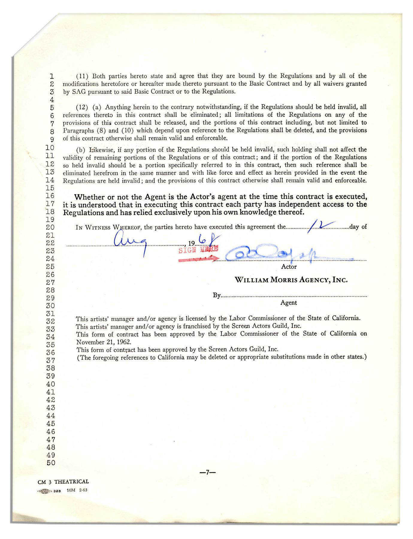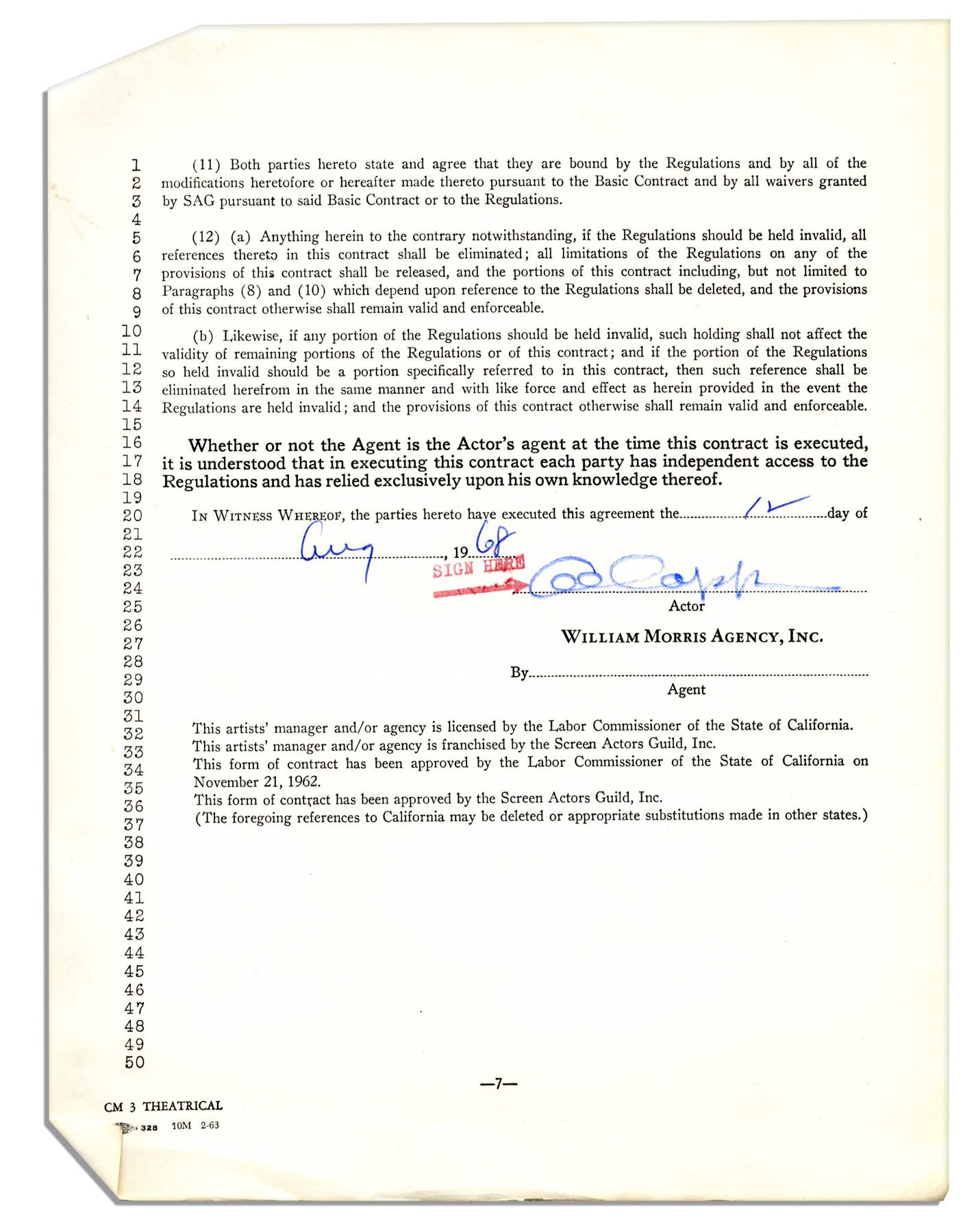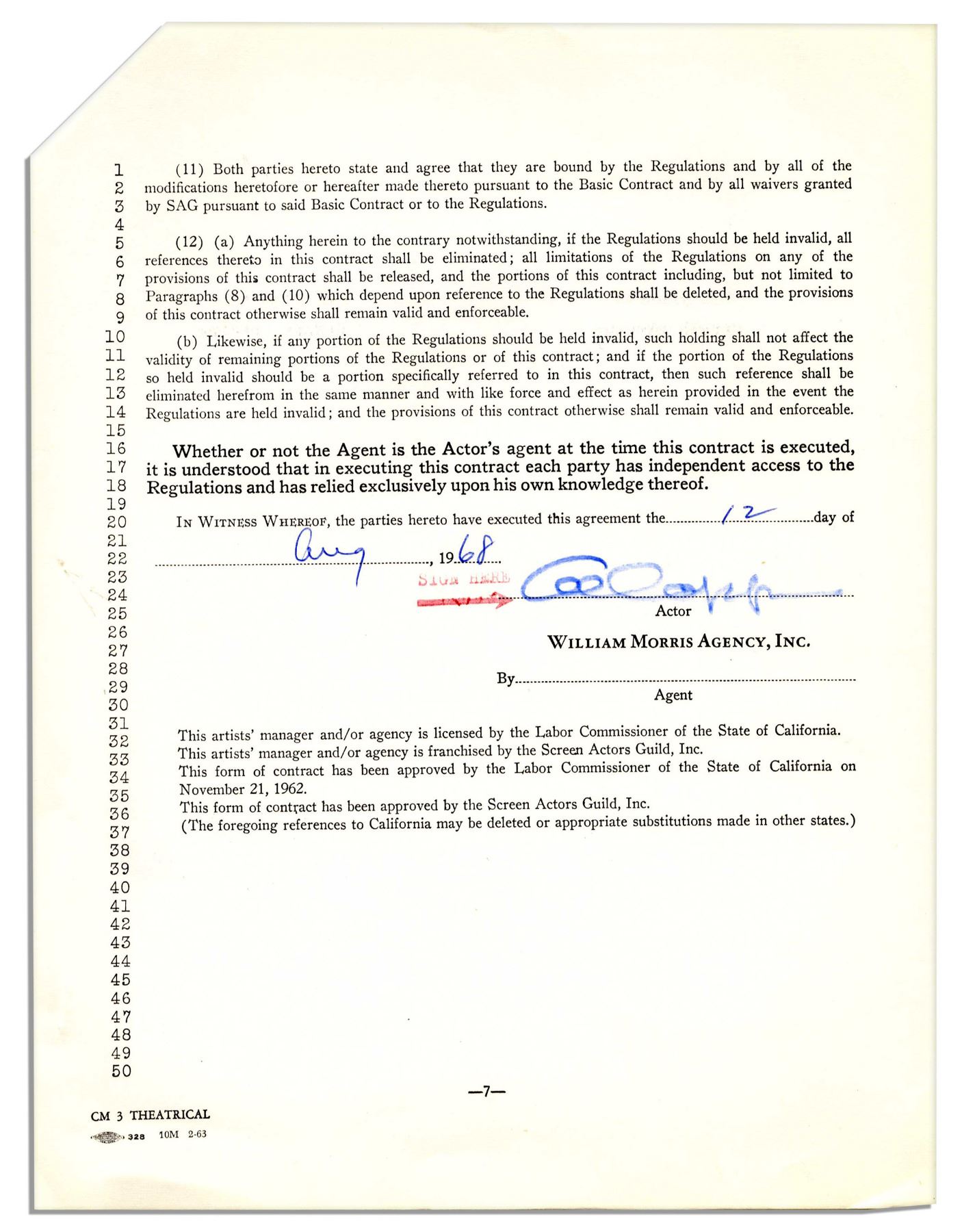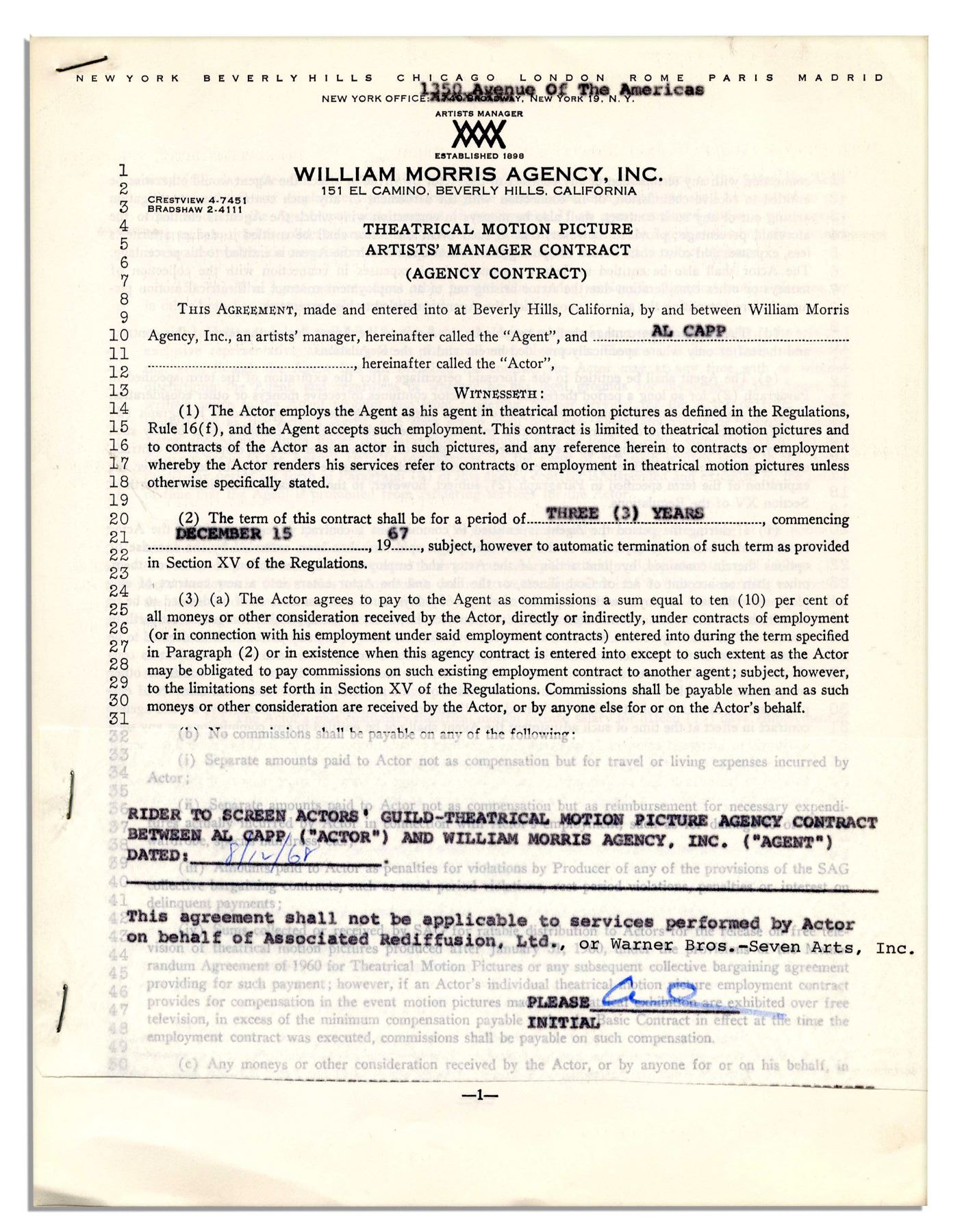 Lot of three contracts signed by Al Capp with the William Morris Agency, all from the late 1960s. Contracts list Capp's various agents with the terms denoting 10% of his earnings to be paid to them. Each contract is signed by Capp ''AC'' in blue ink on a slip stapled to page one, and ''Al Capp'' to page four. Contracts measure 8.5'' x 11'' and each run 7pp. Toning and creasing, else near fine.