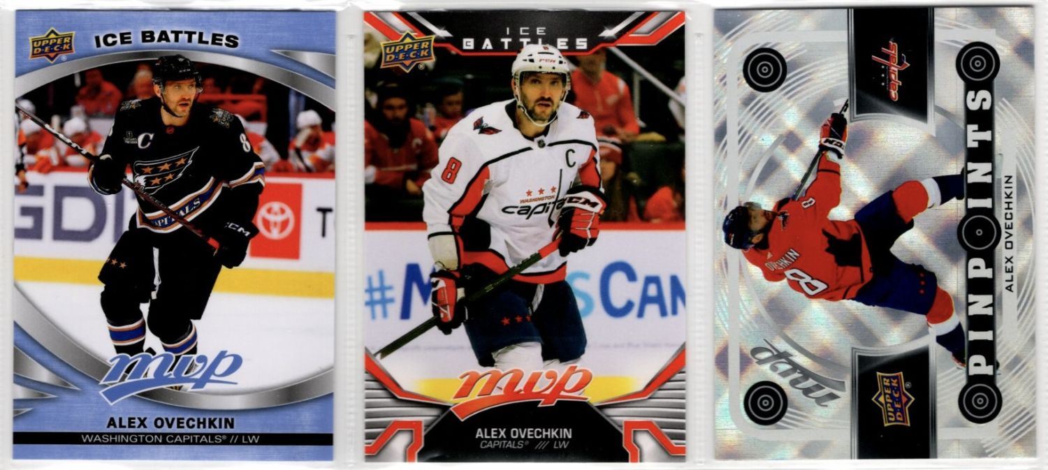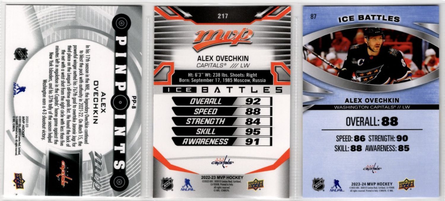 Lot of 3 Alex Ovechkin Inserts. 2 Upper Deck Ice Battles #87, #217 & MVP Pinpoints #PP-8