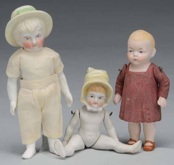 Description Ca. 1900-1920. White bisque boy with molded hat, jointed shoulders and hips (chip on thumb), white bisque girl with molded hat, Hertwig pink bisque girl with molded dress. Condition (Excellent). Size Largest: 5" T.