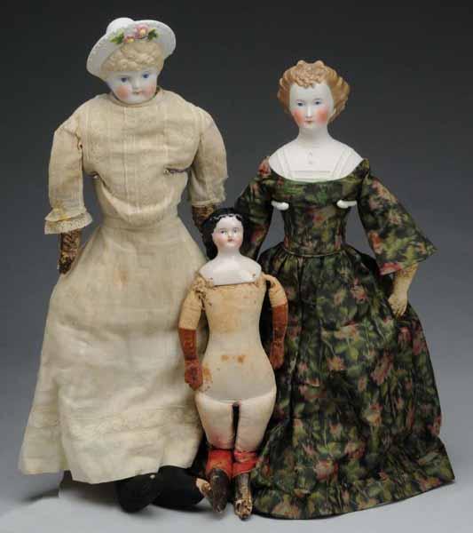 Description Germany, Ca. 1860-1890. Hertwig bonnet head, cloth body with leather lower arms, original clothes. Parian with repaired plate, original cloth body with leather arms, vintage clothes. China head with faint pink tint, old cloth body with leather lower arms and boots (one foot crushed). Condition (Fair). Size Largest: 23" T.