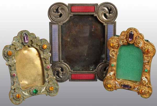 Description Includes a pair of Czech matching frames with jewels and one unmarked frame with enamel work on front. Condition (Excellent). Size Largest: 3 - 3/4" x 3".