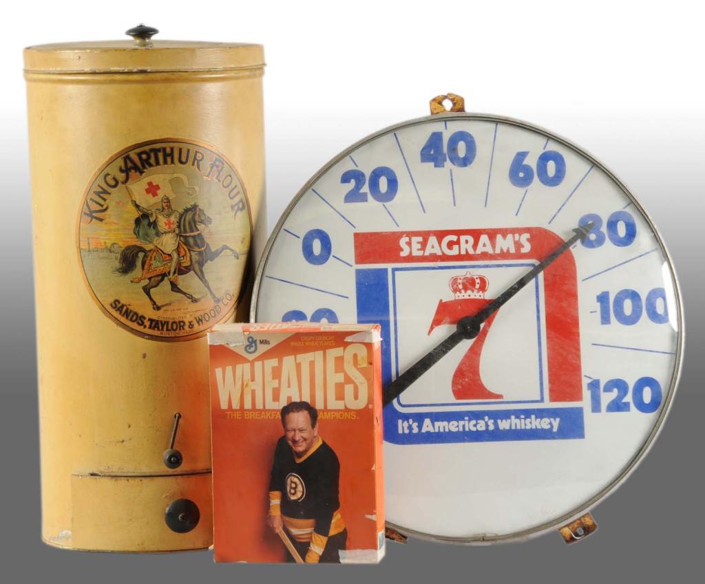 Description Includes one King Arthur flour bin, one reproduction Wheaties box and one Seagram's dial thermometer. Bin has repaint and all three pieces have general wear and roughness. Condition (6.0, Good). Size Largest: 21" T.