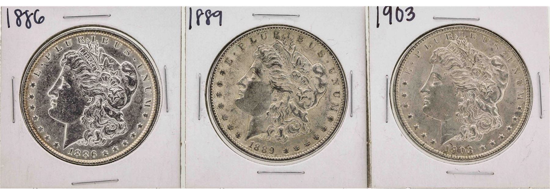 One Lot of (3) Assorted Date $1 Morgan Silver Dollar Coins.