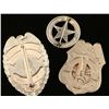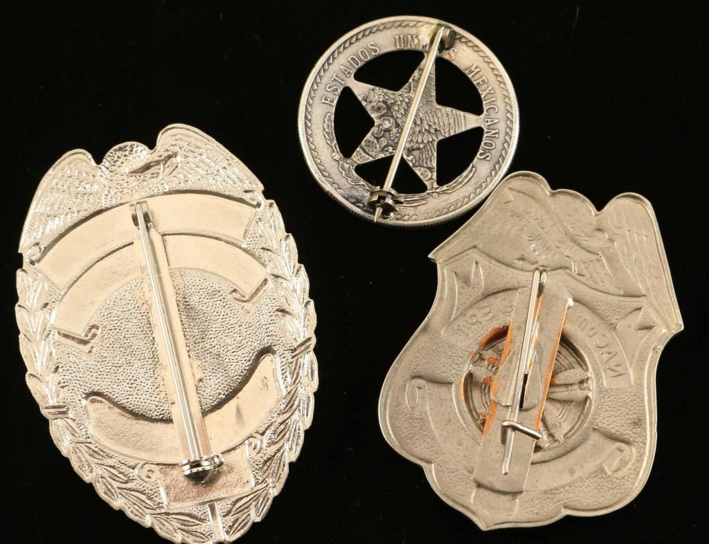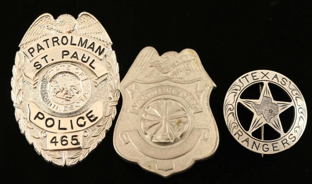 (1) Old West Frontier Battalion Texas Rangers Cowboy Era Police Law badge, measures 1 9/16" in diameter. The front reads "Texas Rangers" with an outline of the state of Texas in the center and has oak leaves on each side. The reverse shows a Mexican Peso coin. Has a thin vertical pin back with locking catch. This is a round Peso with a cut out star in the center. Silver construction. This badge is over 75 years old and carries no law enforcement powers and it does not resemble any current badge. (1)Obsolete US Army Nacom Fire Department Fireman's badge, measures 1 7/8" wide X 2 9/16" tall. The front reads "US Army Nacom Fire Dept". Has a thin vertical pin back. This is an eagle top badge with a shield below and fire trumpets in the center. One piece nickel construction. Excellent condition. This badge is obsolete and carries no law enforcement powers. It does not resemble any current badge. (1) Obsolete St. Paul Minnesota Patrolman #465 Police Law Badge, measures 2" wide X 2 15/16" tall. The front reads "Patrolman St Paul Police #465 Great State of Minnesota". Has a thin vertical pin back with a locking catch. This is an eagle top badge with S shield below and the state seal in the center. Two piece nickel construction. Excellent condition. This badge is obsolete and carries no law enforcement powers and it does not resemble any current badge.