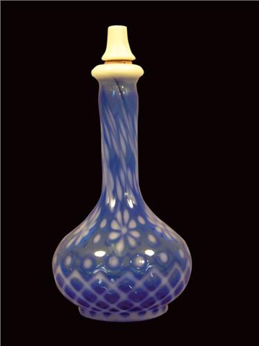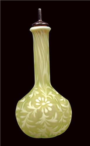 Three Barber Bottles including cranberry milk glass, vaseline milk glass and cobalt blue milk glass all with floral design. No chips or cracks. Aprox. 7 1/2 inches tall.