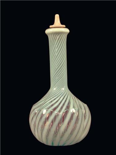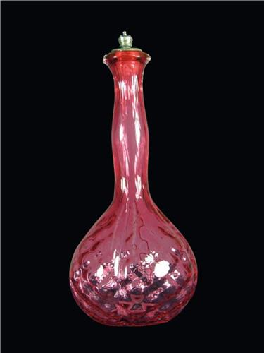 Three Barber Bottles including cranberry glass with thumbprint design, cranberry glass pillow puff design and blue milk glass with swirl design. No chips or cracks. Aprox. 7 to 8 1/2 inches tall.