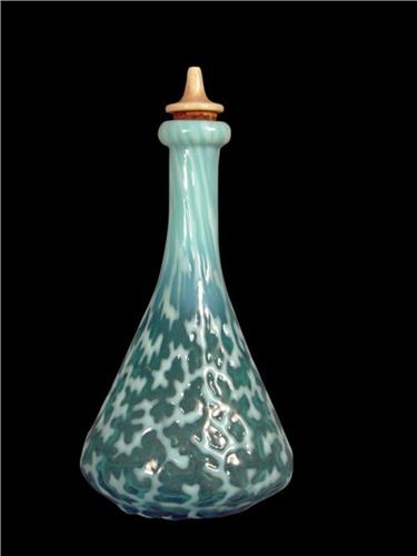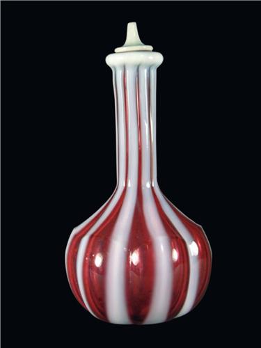 Three Barber Bottles including blue, aqua, red and white ribbon design, cranberry and milk glass and aqua milk glass. No chips or cracks. Aprox. 6 to 8 1/2 inches tall.
