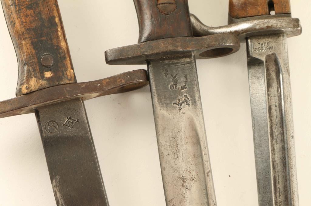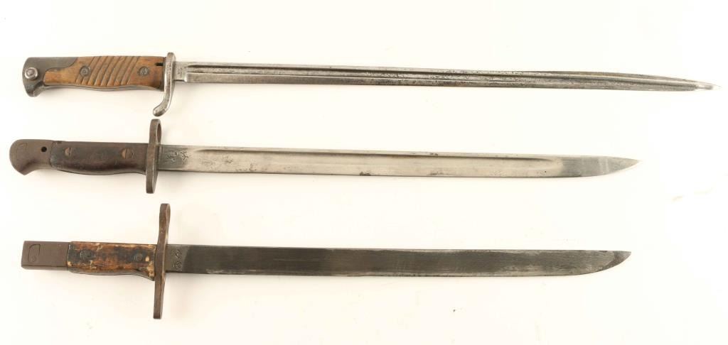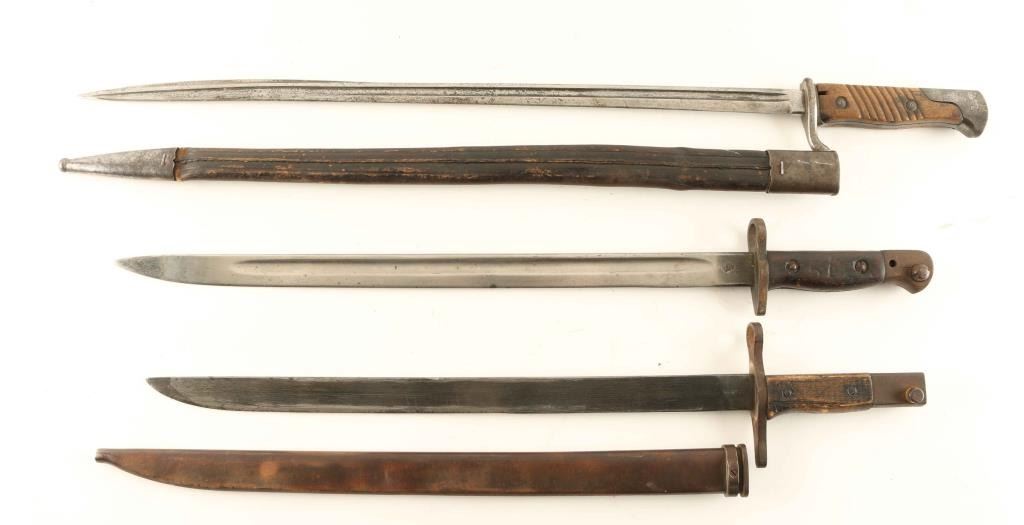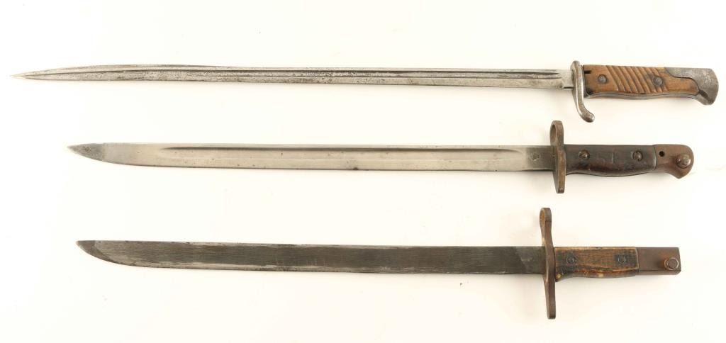 Japanese Arisaka late war without quillion, British Enfield bayonet marked 1907, German Mauser bayonet by Simson circa 1870 with intact leather scabbard.
