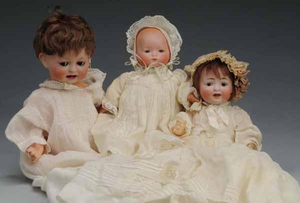 Description Germany, Ca. 1910-20s. Rare Alt, Beck & Gottschalck 1322 with flirty eyes, open mouth with teeth, jointed composition body; Hertel, Schwab & Co. 152 on composition body (cracking and peeling), A.M. 341 infant on new cloth body. All nicely dressed. Condition (Very Good). Size Largest: 25" T.
