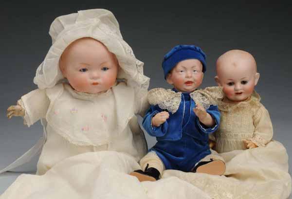 Description Germany, Ca. 1910-20s. A.M. 341 baby on cloth body with composition hands; Franz Schmidt & Co. 1272 baby with sleeping eyes, pierced nose on composition baby body; K & R 100 Baby on composition baby body. All nicely dressed. Condition (Excellent). Size Largest: 14" T.