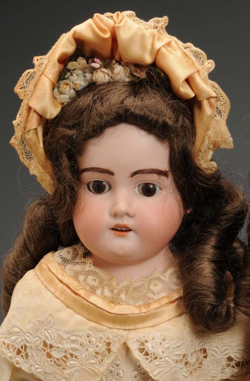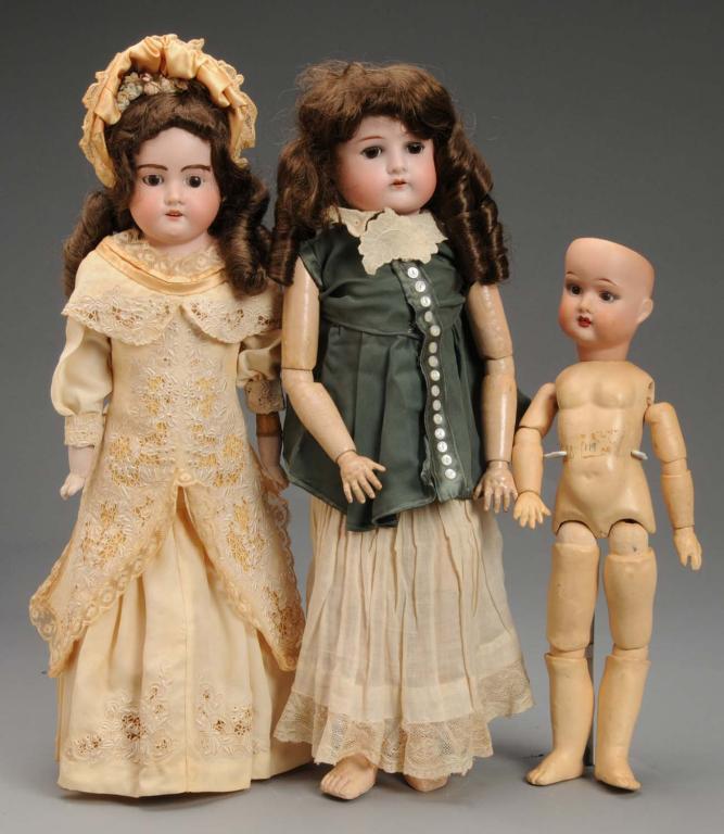 American & German, circa 1915. Bisque socket head incised Fulper with inset glass eyes, heavy lashes, open mouth, repainted jointed composition body and wearing no clothes. Bisque socket head, with small neck flake, incised 1912 by C.O. Dressel, with brown sleeping eyes, open mouth, new long curl wig, and jointed composition body with wear and soiling. Partially dressed. Bisque shoulder head incised "370 Armand Marseille", with set brown eyes, open mouth, real eyebrows, oilcloth body with some mends, bisque lower arms with chipped fingers, and redressed in cotton and lace. Condition (Fair - Good). Size Largest: 22" T.