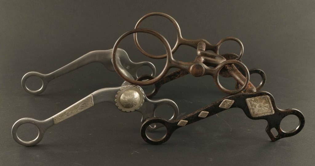 (1) Crocket marked stainless steel bit with etched leaf design on shank and concho. (1) Crocket marked bit with etched silver diamond design, shows rust, and one other.