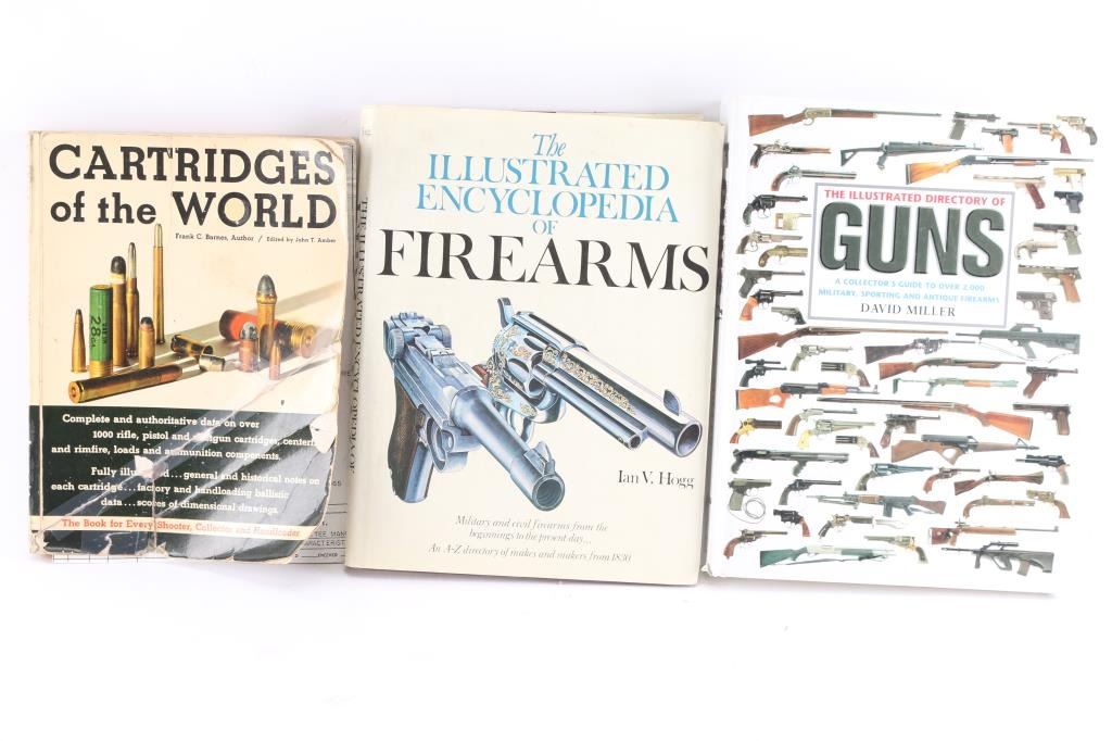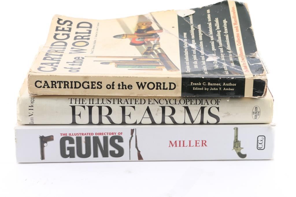 Includes: Cartridges of the World (1st Ed. Copyright 1965) by Frank C. Barnes, fair to good condition; The Illustrated Encyclopedia of Firearms (1st Ed.) by Ian V. Hogg, good to very good condition; The Illustrated Directory of Guns (Copyright 2005) by David Miller, good condition.