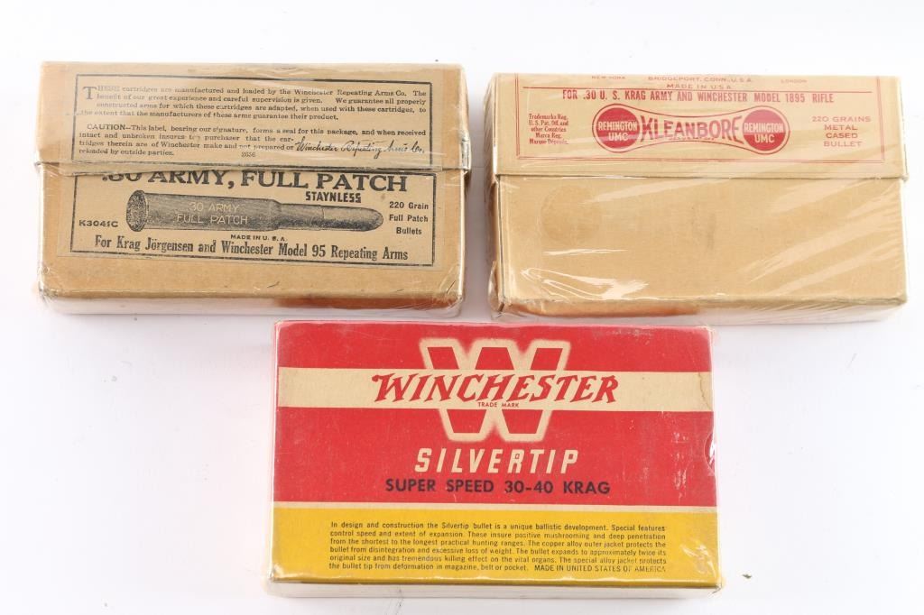 Opened. A. Flaming Winchester, stainless red and yellow box, silver tip. 8.5 condition on 1-10 scale. B. Remington VMC 30-40 Krag & Winchester smokeless cartridges 220 grain. 9 plus condition on 1-10 scale. C. Plain brown label, box of cartridges with cartridge pictured by Winchester and marked for Krag Jorgensen and Model 95 repeating arms. Near fine box with exception labels. 8.5 to 9 condition on 1-10 scale.