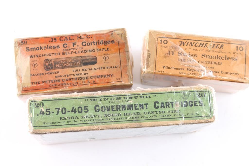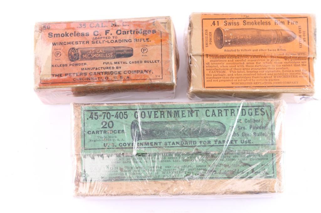 (A) Opened full box. 45-70-405 Government cartridges. Extra heavy solid head. Green label. Good to V.G. condition.(B) .35 cal M.C. smokeless for Winchester self loading rifle by Peters Cart. Co. Good with tattered label howing losses. (C) .41 Swiss rimfire (vetterli and others) orange label. Very good.