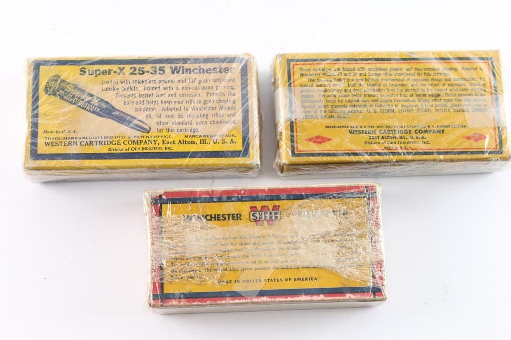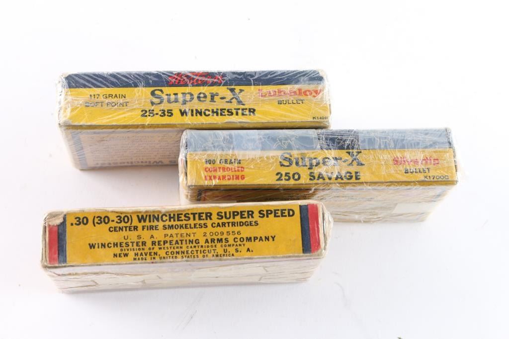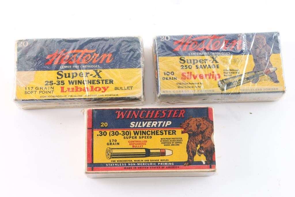 All opened full boxes as follows: A. Picture box with bear waving "Hello Boys" 250 Savage Silver Tip. B. Winchester Western 25-35, 117 grain. C. 30-30 with bear on all four's squaring picture box. All in 8+ condition on 1-10 grading scale.