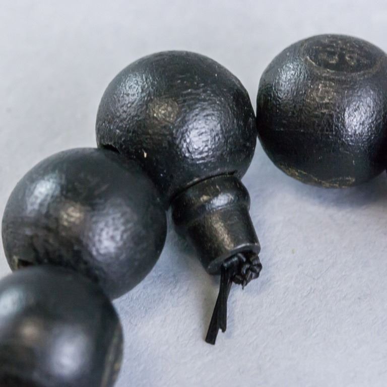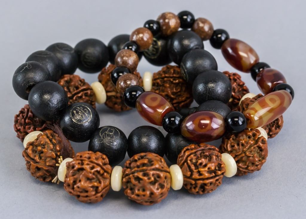 Lot of 3 bracelets. Of wood, agate, and walnut. Black wooden beads stamped with the character "fo" for Buddha. Walnut beads accompanied with flat round spacers. 8 cm. 64 grams (total).